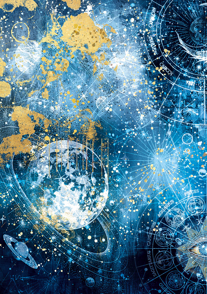 An enchanting journey through stars, planets, and cosmic symbols comes to life in this extraordinary collection, where art and mystery intertwine in perfect harmony. Deep shades of blue blend with golden details, creating evocative atmospheres inspired by the universe and its infinite beauty. Ethereal figures, glowing constellations, and astrological motifs combine in elegant and captivating compositions, transporting the viewer into a dreamlike and timeless dimension. Ideal for those who love the mystery of the cosmos and the magic of infinity, this collection is an invitation to lose yourself in the wonders of the universe.