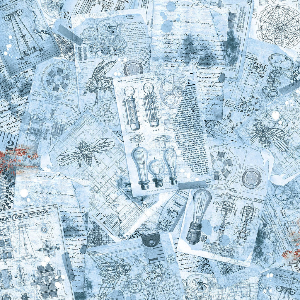 This paper pad has images of mechanical bees and birds, gears, bright bulbs and more.