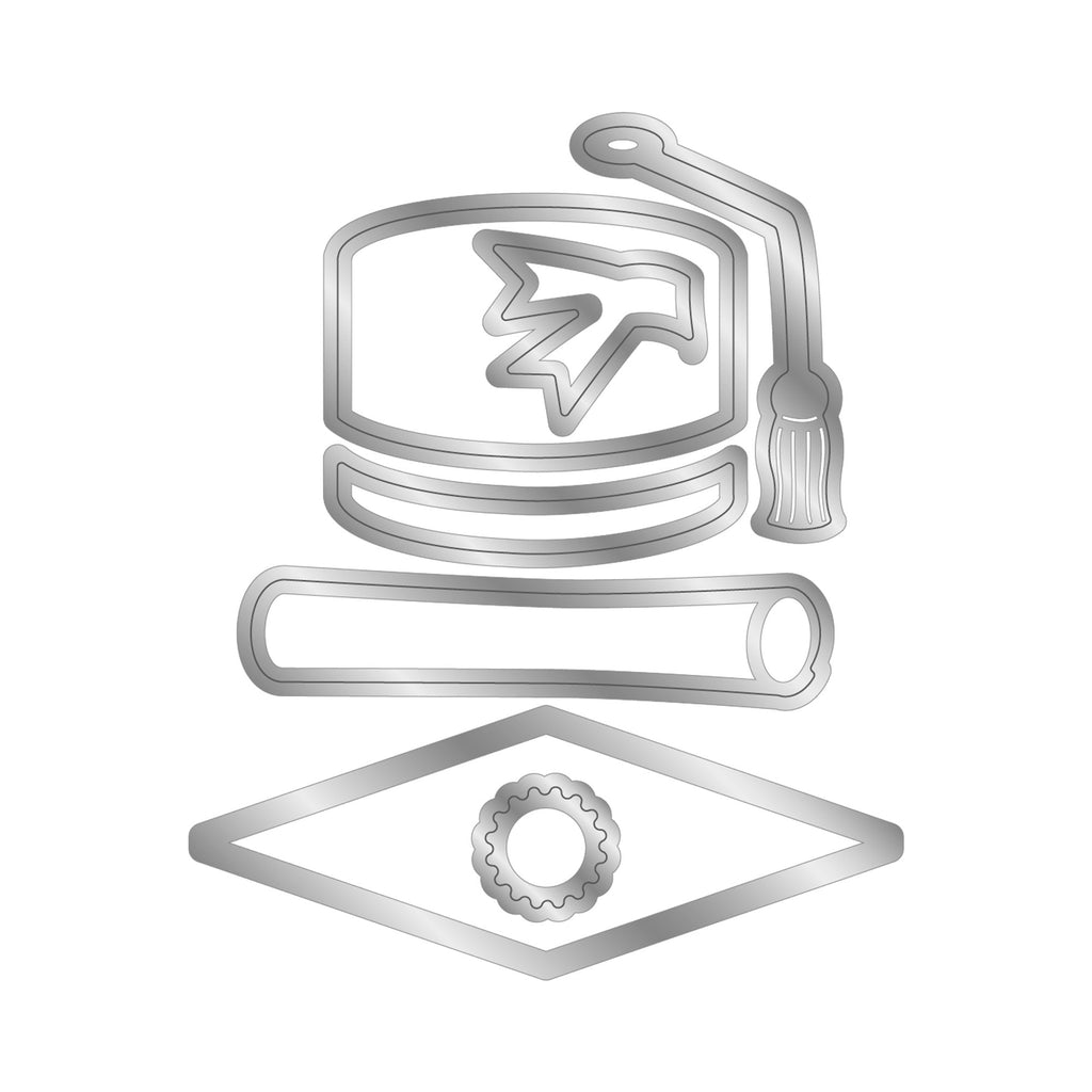 - Includes seven metal dies to create a papercraft graduation cap and scroll