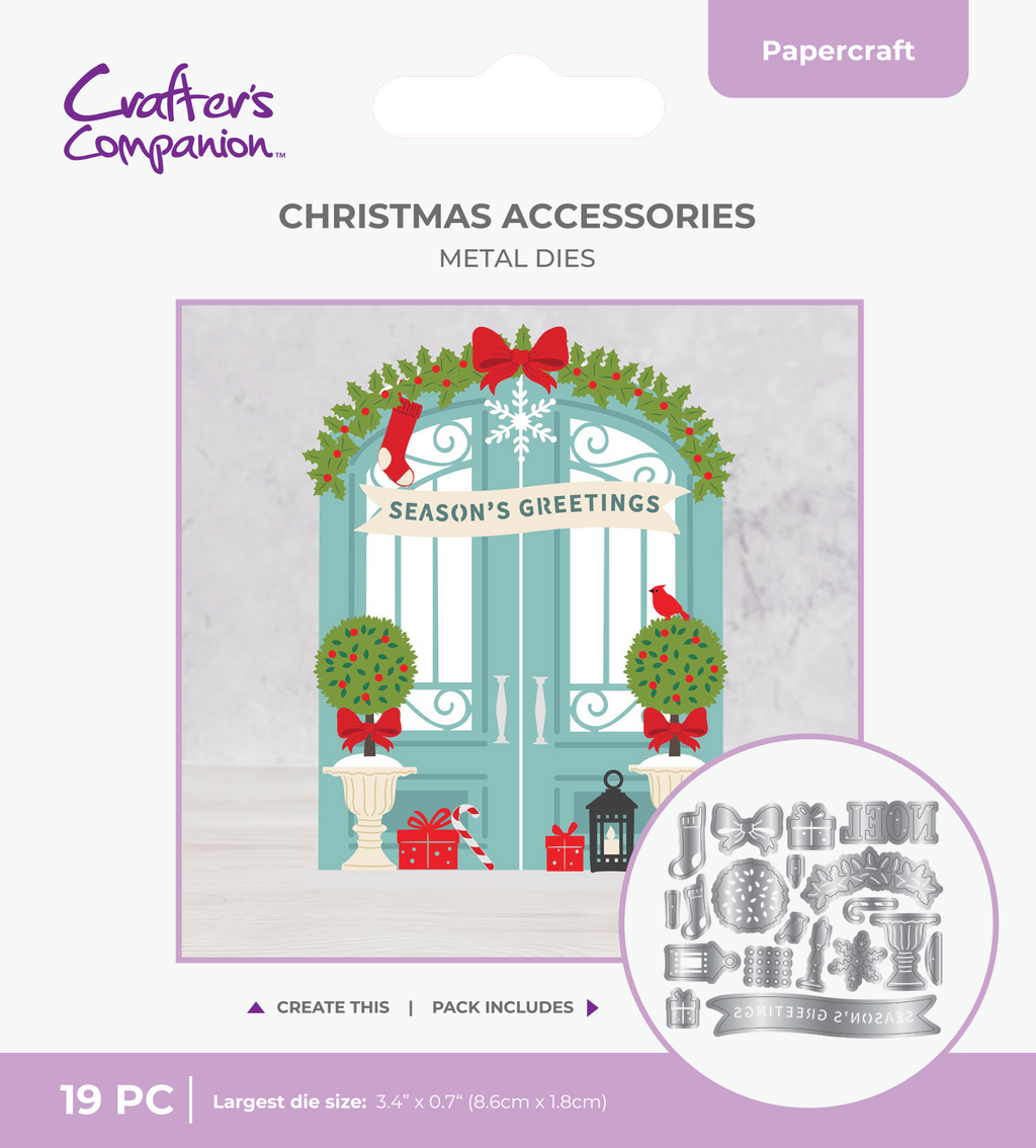 Transform your doorway or fireplace into a festive celebration with the Christmas Accessories Die Set from Crafter’s Companion. With 19 metal dies, this set includes stockings, wreaths, garlands, and more. Perfect for adding classic Christmas cheer to your handmade cards, tags, and scrapbook pages.