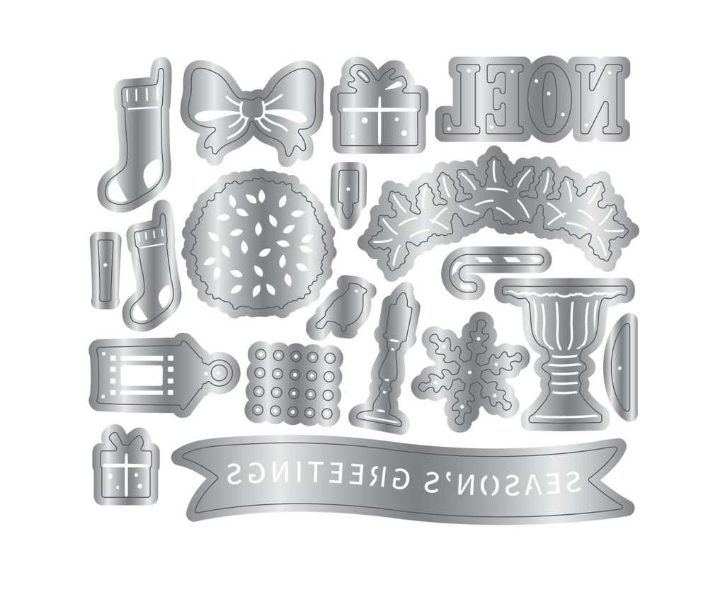 • Die set includes Christmas stockings, garland, presents, candy canes, sentiment banners and more
