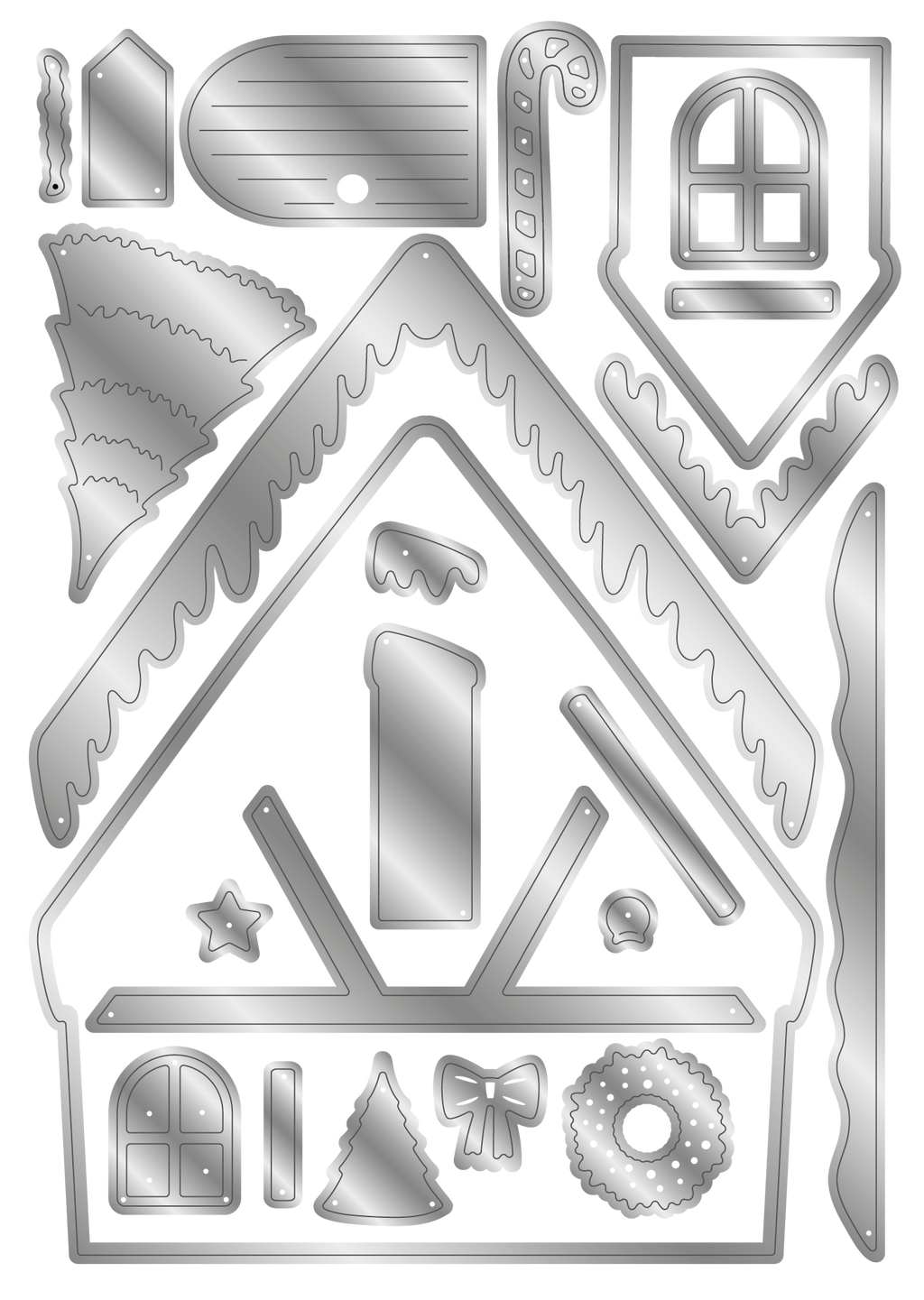31-piece stamp and die set to create a shaped card base of an idyllic Christmas cabin card base.