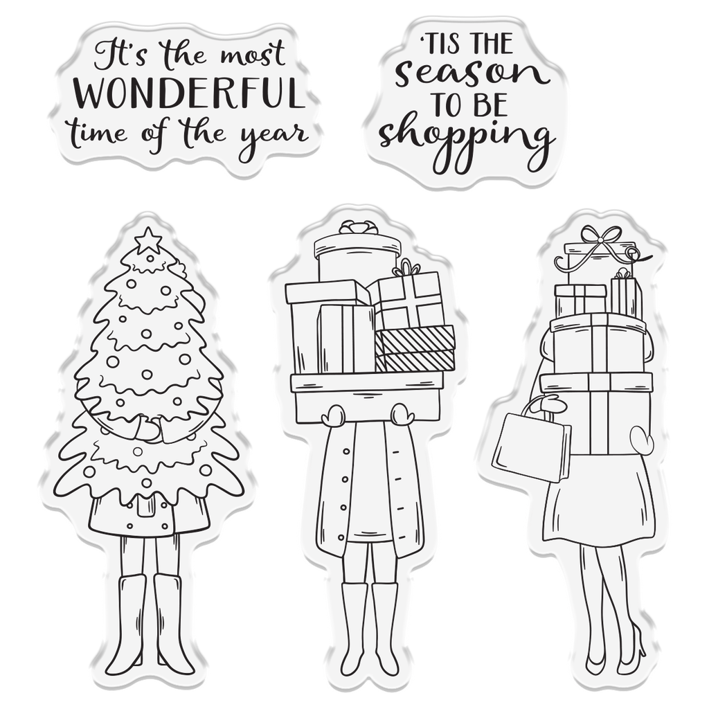 Grab your shopping bags because ‘Tis the Season to be Shopping, and this seasonal Photopolymer Stamp set. This 5-piece set includes three stamps of Christmas shoppers overwhelmed with the amount of presents they have to carry and two accompanying sentiment stamps, ideal for your themed handmade Christmas cards and gift boxes.