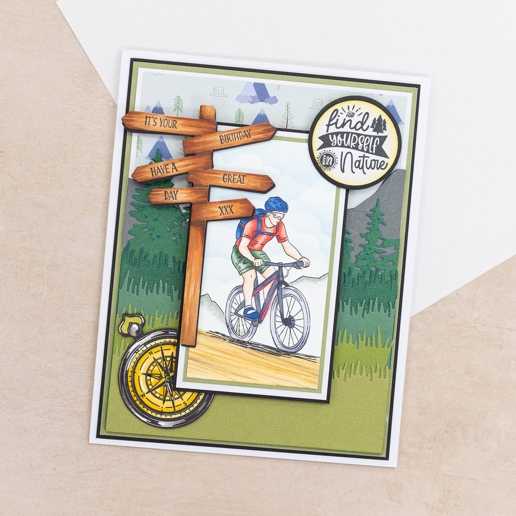 Take a ride on the Wild Side with this Clear Acrylic Stamp Set from The Great Outdoors collection by Crafter’s Companion. This stamp of a cyclist traversing the great outdoors brings a sense of adventure to your crafts and projects, whether it’s a handmade card or a personalised gift box.