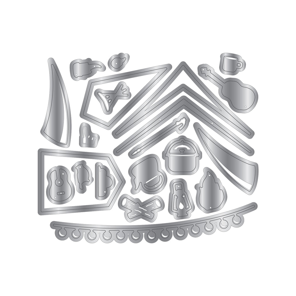 • 22-piece metal die set to create a tent with accompanying camping images of guitars, lanterns, walking sticks, boots, and more