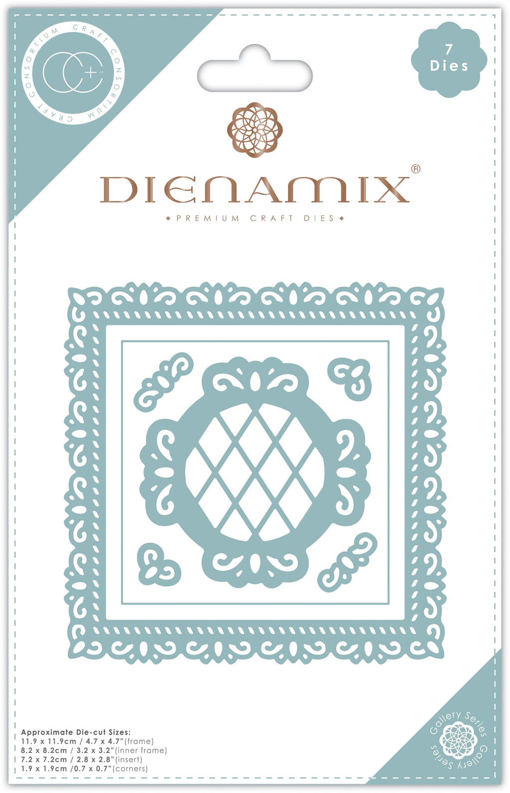 Introducing the latest brand to the Craft Consortium portfolio, Dienamix® Premium Crafting Dies - Durable, Dynamic, Multi coordination, Innovative, Versatile. Set apart in a rose gold premium carbon steel, with exclusive & unique, registered designed in a series of coordinating themes. Dienamix® dies are able to cut up to 300gsm card and are compatible with most leading die-cutting machines. Packaged in a recycable card envelope, which is both user friendly and perfect for mechandising, with no lost space from oversized plastic blisters. Finished with spot varnish highlights and foild logo for visual impact. Dienamix® dies are arranged in distinct series which are easily identifiable by the packaging colour. . Approx Die-cut Sizes: 11.9 x 11.9cm / 4.7 x 4.7" (frame)