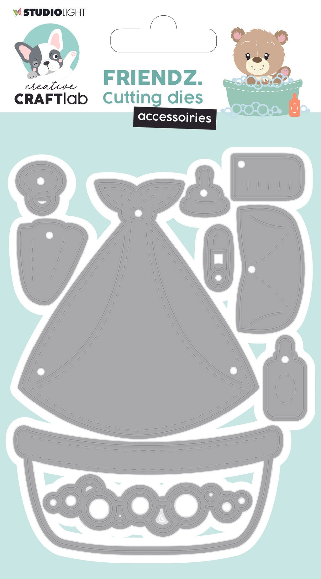 This cutting die set includes baby accessories and works perfectly with set CCL Cutting Die Bear Ted Friendz (CCL-FR-CD155).  Includes a tub, bottle, safety pin, bubbles and more.