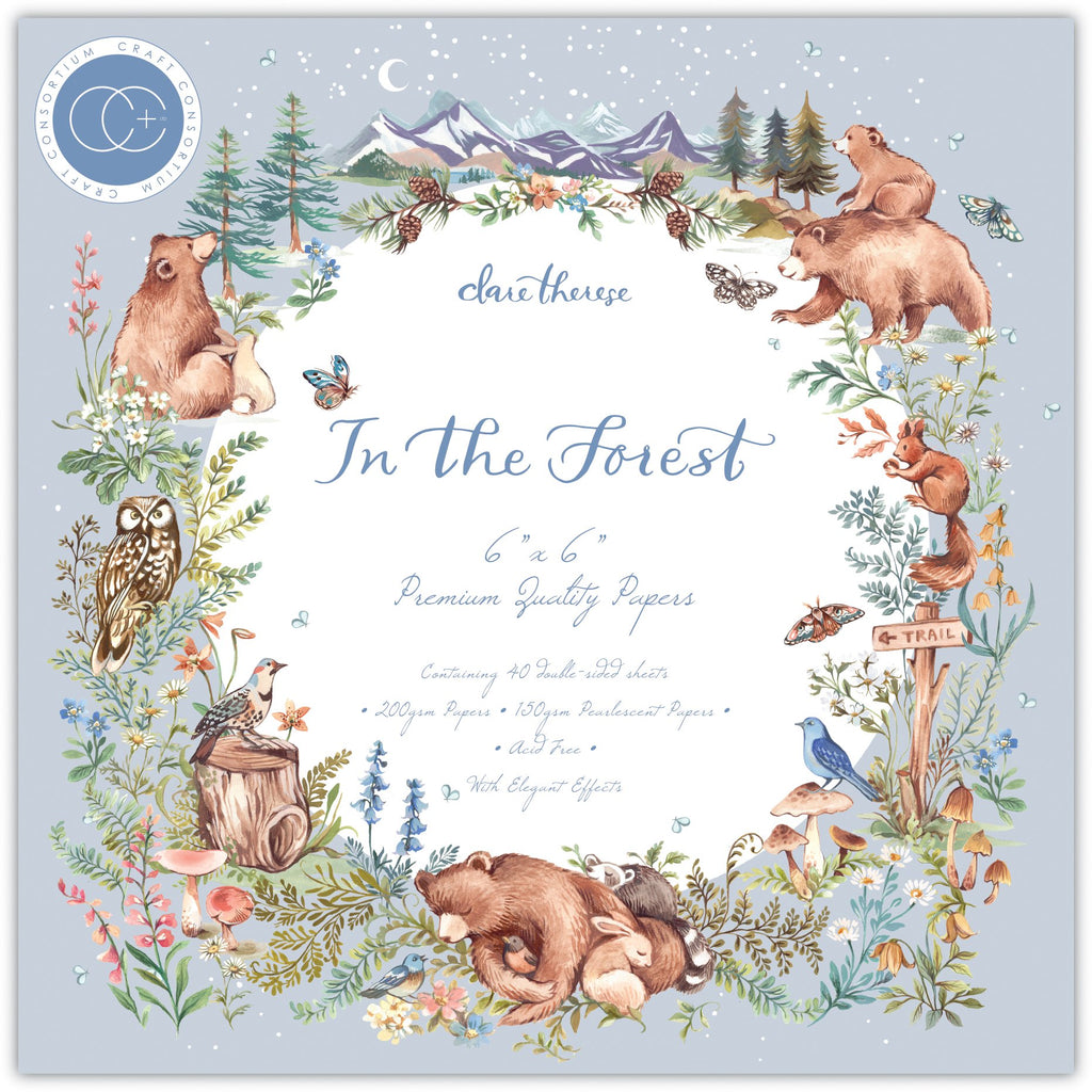 Premium 6"x6" gummed paper pad with both inner front and back covers adorned in topper and ephemera elements and ephemera, the pad containing 40 double sided sheets in heavyweight 200gsm, acid free cardstock. Ideal for die-cutting and distressing. With elegant pearlescent and spot varnish effects. Includes images of bears, raccoons, rabbits, butterflies, birds, florals, toadstools, trees and nature scenes.