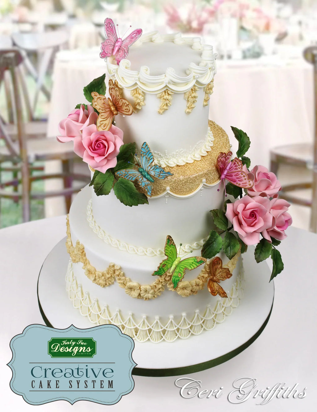 This mould contains three different butterfly wings plus a body. Intricately designed they will each make a gorgeous sugar craft embellishment for cakes. Innovatively designed the mould will allow you to fold in the centre to double emboss the wing on its reverse. The incredible detail in these wings also works beautifully as Fairy wings. The ground breaking Creative Cake System has been co-created with leading international cake artist Ceri Griffiths, and allows cake decorators to use sugar paste or fondant to achieve a professional Royal Iced look to their cakes. The silicone molds in the Creative Cake System will create the building blocks of the royal icing technique in fondant or sugar paste. Together these innovative moulds work in endless combinations of creativity.