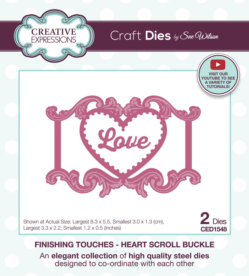From the Finishing Touches Collection this is a wonderful Heart Scroll Buckle set that includes the sentiment 'Love'. Perfect for adding the finishing touch to cards and other paper craft projects. These dies will work beautifully with the other dies from the collection. Why not check out the Creative Expressions YouTube Channel for more inspiration and tips. The dies are compatible with most home die cutting machines. Two die set; largest die 8.3 x 5.5 cm, smallest die 3.0 x 1.3 cm.