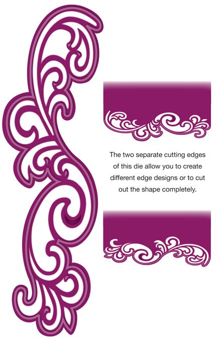 Asymmetrical in shape, but breathtaking in beauty, the Lyra Die set looks amazing set on a diagonal across a card or just cut across the bottom or sides of a card. It has an open, airy feel to it.