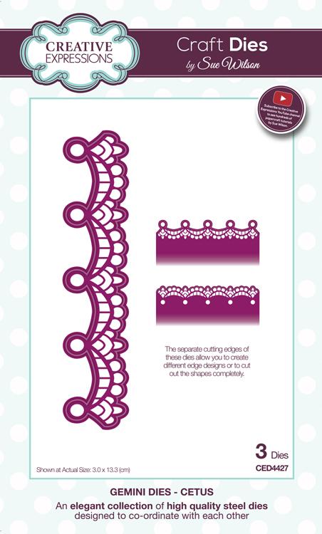 An elegant collection of high quality steel dies designed to co-ordinate with each other. Designed by Sue Wilson. The separate cutting edges of these dies allow you to create different edge designs or to cut out the shape completely.