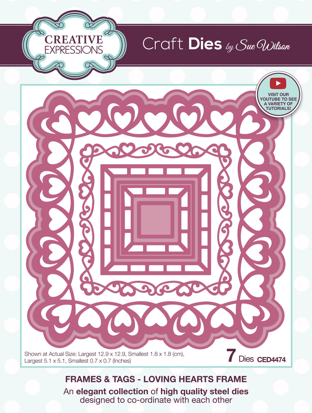 This seven-die set from the Frames and Tags Collection makes a perfect card front or use the heart frames for scrapbook pages and other paper craft projects. The dies are compatible with most home die cutting machines. They will mix and match effortlessly with other dies from the collection. Don’t forget to check out the Creative Expressions videos on YouTube for more inspiration and tips. This is a seven-die set – largest die 12.9 x 12.9 cm smallest die 1.8 x 1.8 cm.