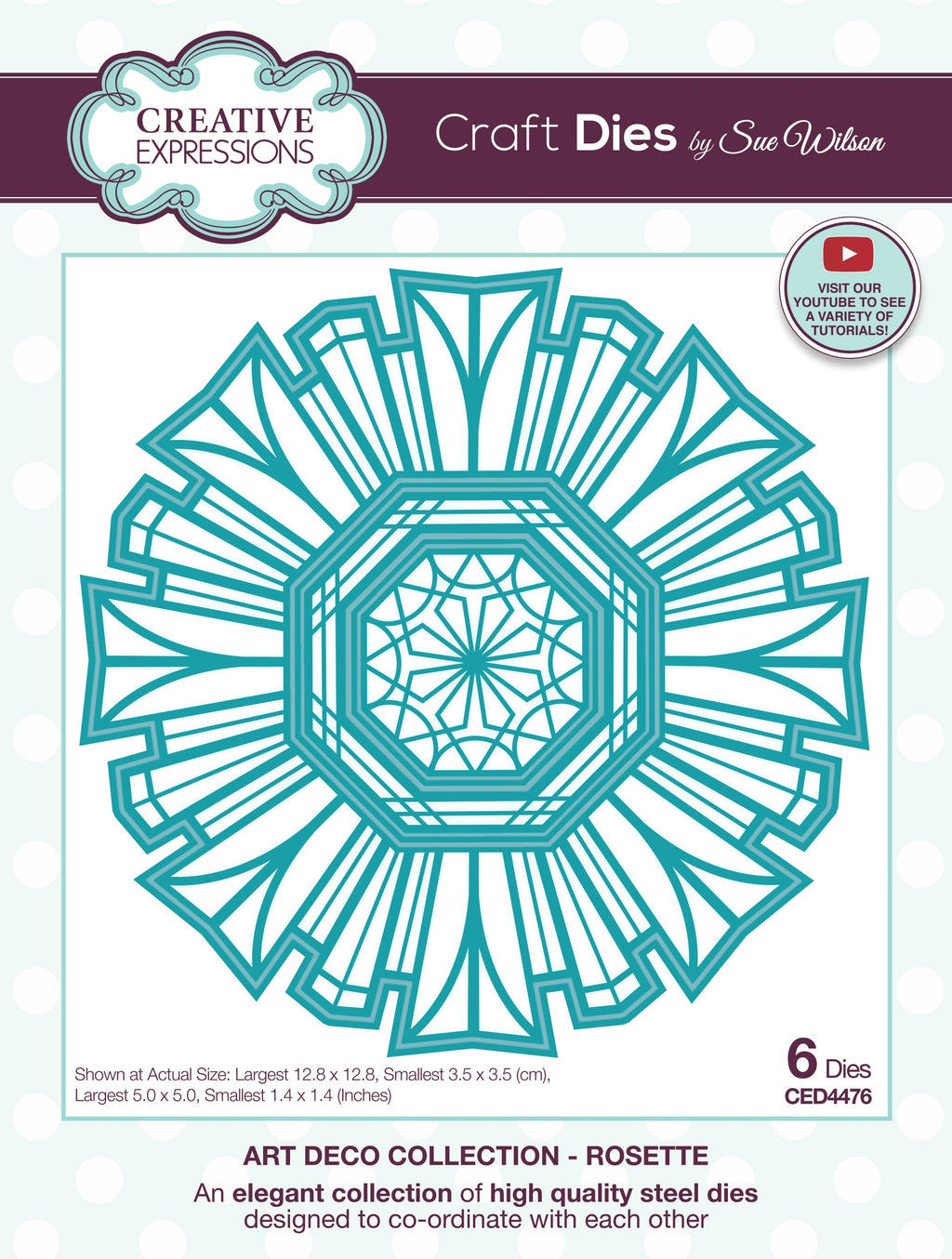 Add an elegant touch with this Rosette craft die, part of Sue's Art Deco Collection. Perfect to create gorgeous focal point for your projects or use to add backgrounds or frames to a card or scrapbook page. The high quality steel dies are compatible with most home die cutting machines and will work with the other dies in the collection or on its own. Made In China. 6 dies. Largest Die 12.8 cm x 12.8 cm (5.0 ins x 5.0 ins).