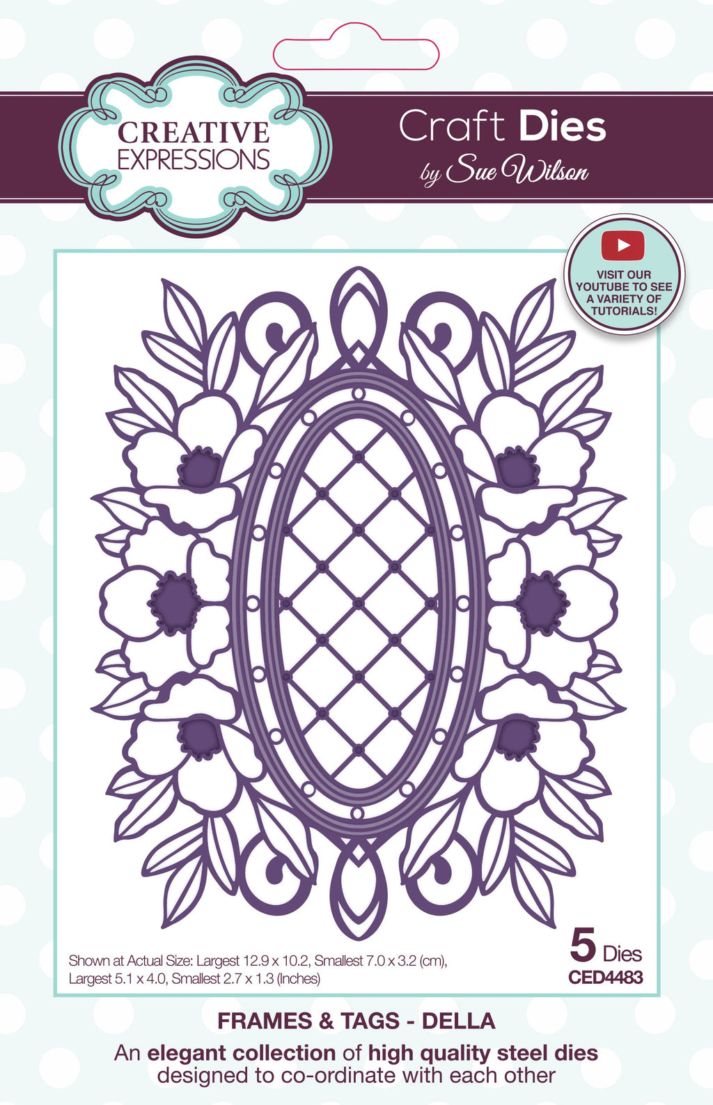 This gorgeous Frames & Tags Della Craft Die is part of Sue's Floral Frames collection. Perfect to create gorgeous focal points for all your cards and projects, mix and match with other dies in the collection to create your own unique artwork. The high quality steel dies are compatible with most leading die cutting machines and will work with the other dies in the collection or on its own. Made In China. 5 dies. Largest Die 12.9 cm x 10.2 cm (5.1 ins x 4.0 ins).