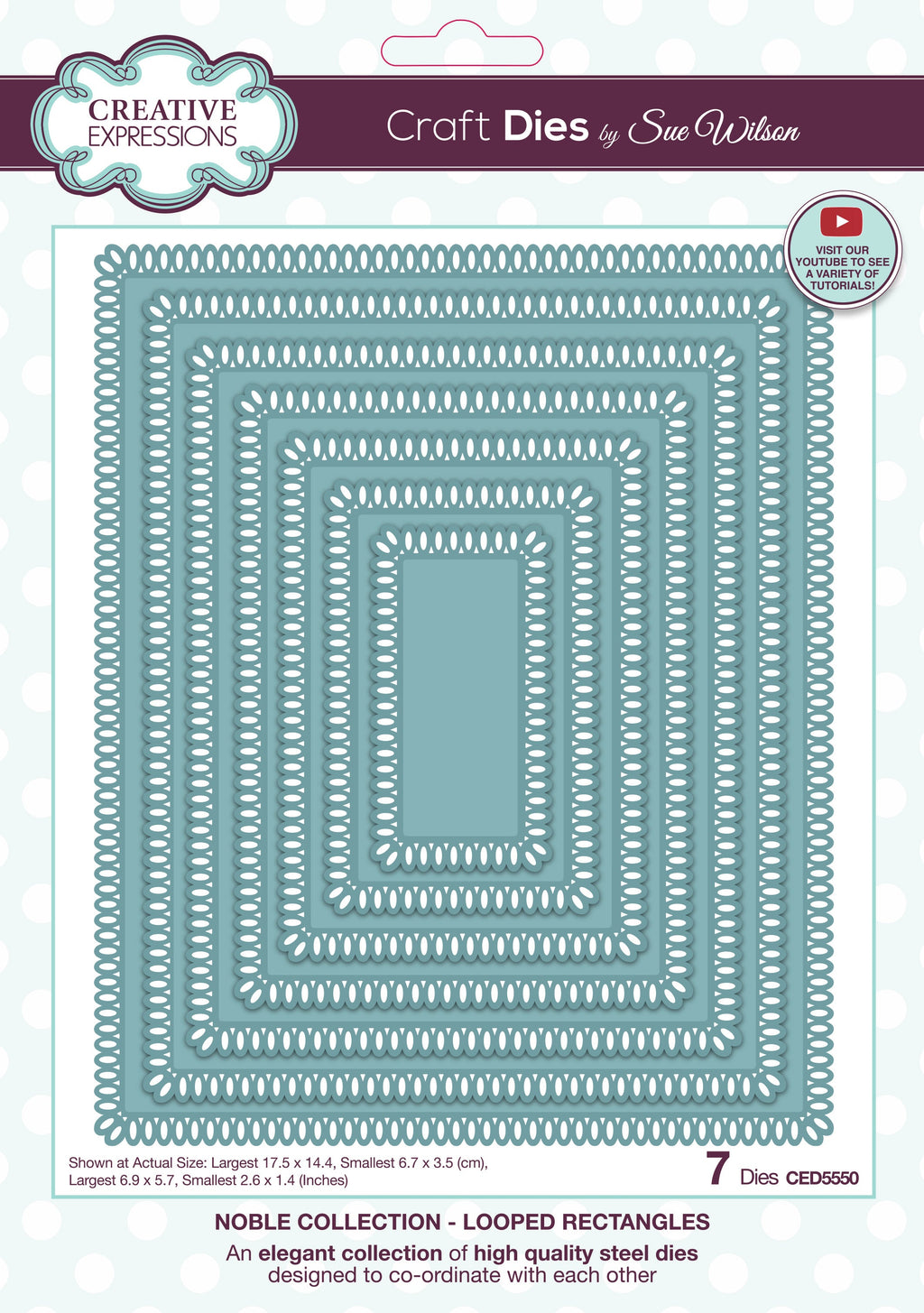 This Looped Rectangles craft die has a delicate looped border which adds an elegant finish to a card or scrapbook page. Perfect for frames or to add an extra detail to cards, scrapbook pages and so much more. The high quality steel dies are compatible with most leading die cutting machines and will work with the other dies in the collection. Made in China. 7 dies; Largest die 17.5 cm x 14.4 cm (6.9 ins x 5.7 ins).