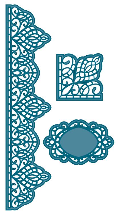 This beautiful set includes a scalloped border, corner and tag with a scroll-look. This is always a versatile set as you can create such a great look with just one of these elements by cutting more than one and repeating them for an added effect.