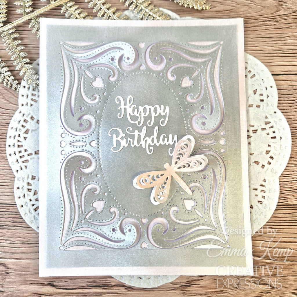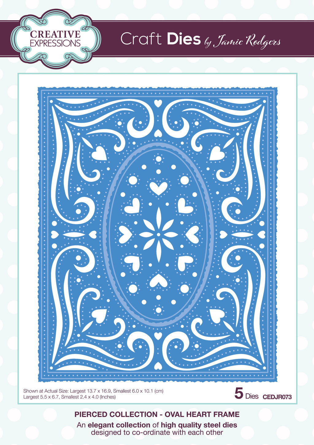 This pierced frame die set designed by Jamie will make a great card front with the intricate patterns and textures of the elegant heart design. The dies are compatible with most home die cutting machines. Made in China.  Don’t forget to check out the Creative Expressions YouTube Channel for inspiration and tips. Five die set. Largest die 13.7 x 16.9 cm (5.5 x 6.7 inches), smallest die 6.0 x 10.1 cm (2.4 x 4.0 inches).