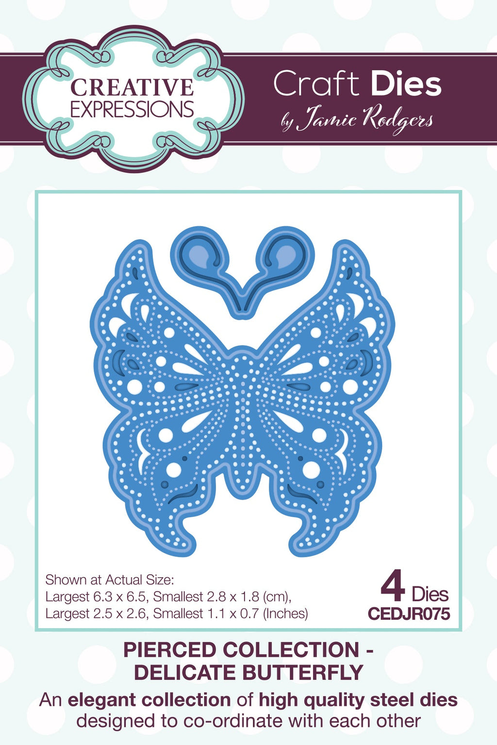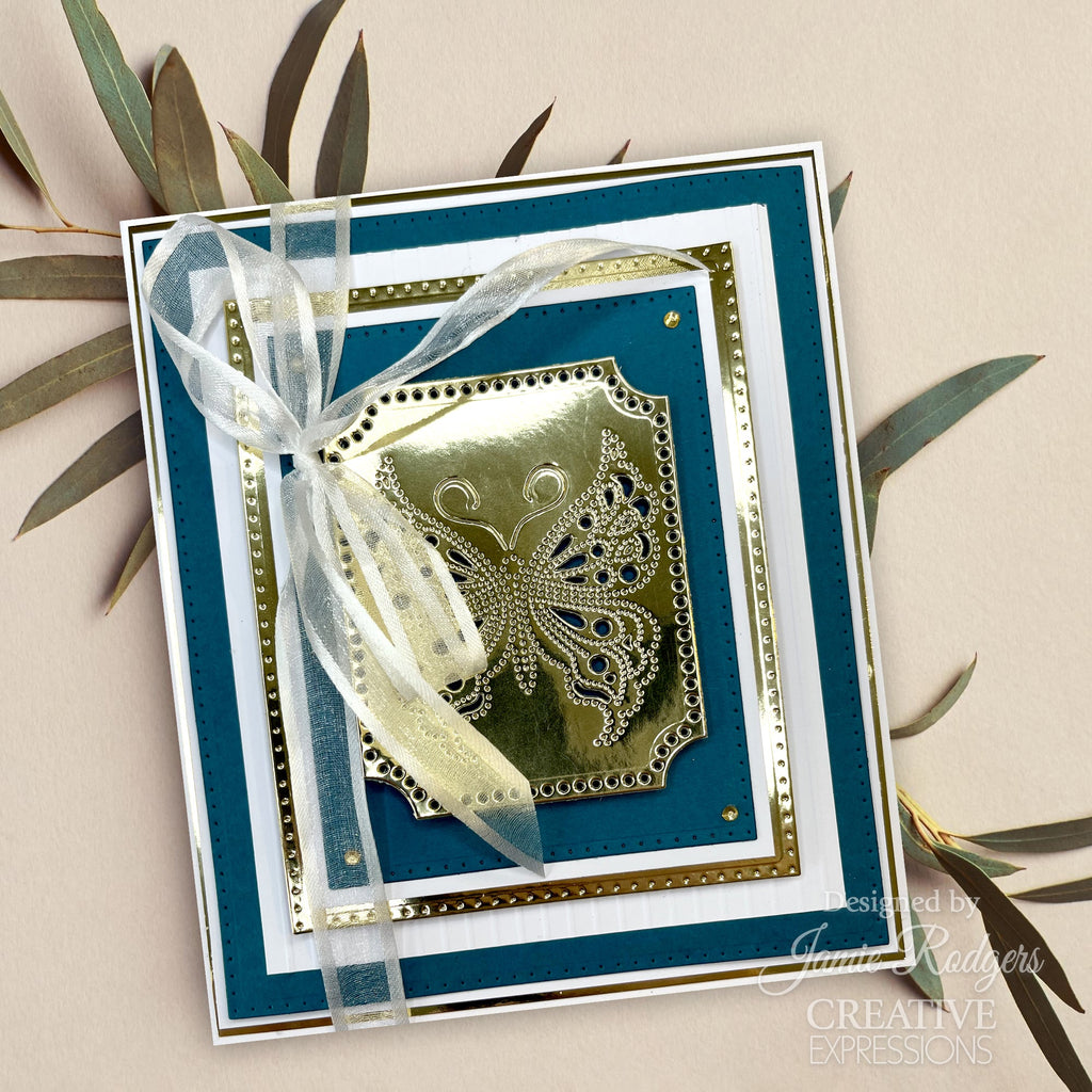 This large pierced die set designed by Jamie will make a great addition to a card front with the intricate patterns and textures of the elegant butterfly design. The dies are compatible with most home die cutting machines. Made in China.  Don’t forget to check out the Creative Expressions YouTube Channel for inspiration and tips. Four die set. Largest die 6.3 x 6.5 cm (2.5 x 2.6 inches), smallest die 2.8 x 1.8 cm (1.1 x 0.7 inches).