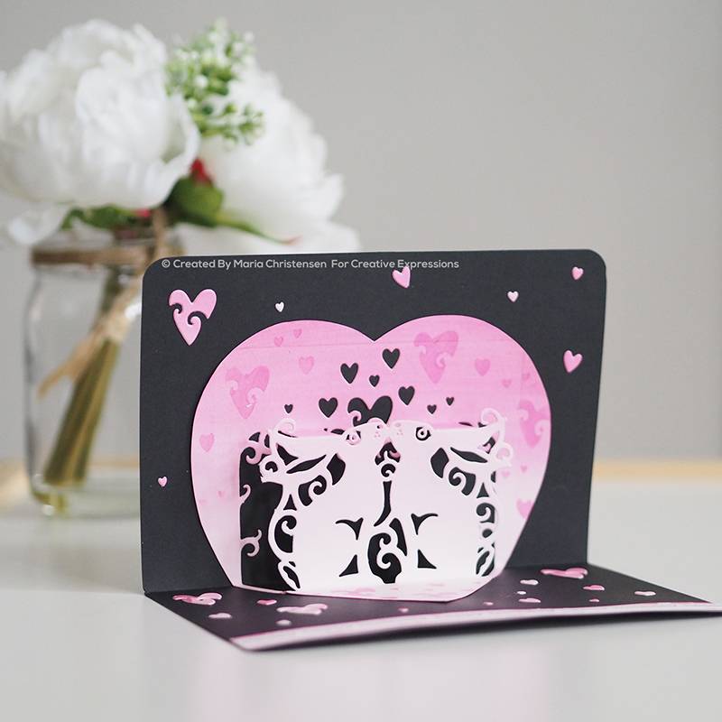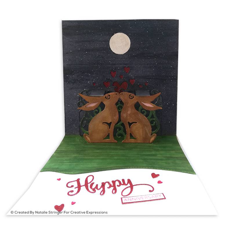 Create a fun and dynamic pop up card featuring 2 cute bunnies kissing with some hearts above them with this pop up die. It would be perfect for Valentine's Day cards.