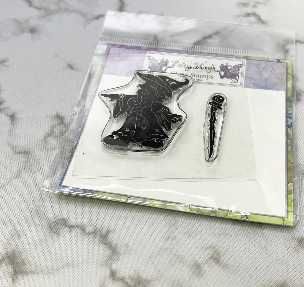 This is a two stamp set with a cute wizard and a wooden staff. The wizard stamp measures 2.00" x 1.75".