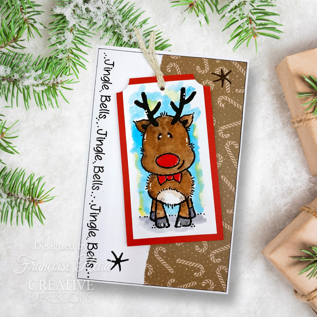 Fun reindeer design that will make you smile, with great words to finish off festive projects. Designed by Francoise Read. This small Christmas stamp set would be perfect for cards and scrapbook pages as well as mixed media or fun décor projects. Ready to mount on an acrylic block the stamps can be used with ink pads, paint, or used with pigment ink and embossing powder. They are suitable for use on paper, fabric, or any other surface depending on the ink choice. Clean your stamps with a wipe, damp cloth or under warm running water depending on the medium you use. Designed and made in the United Kingdom. Four stamp set, 7.6 x 10 cm – (3 x 4 inches).