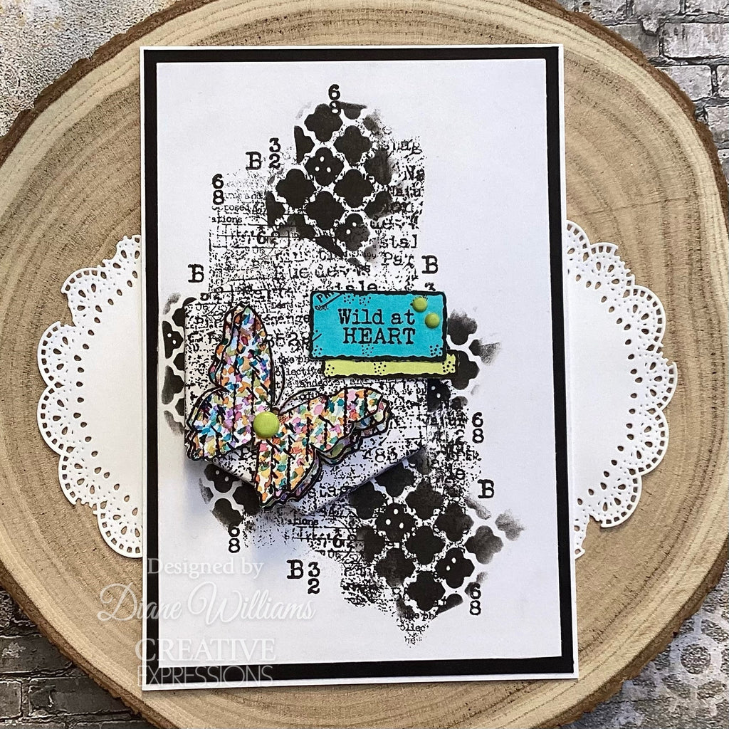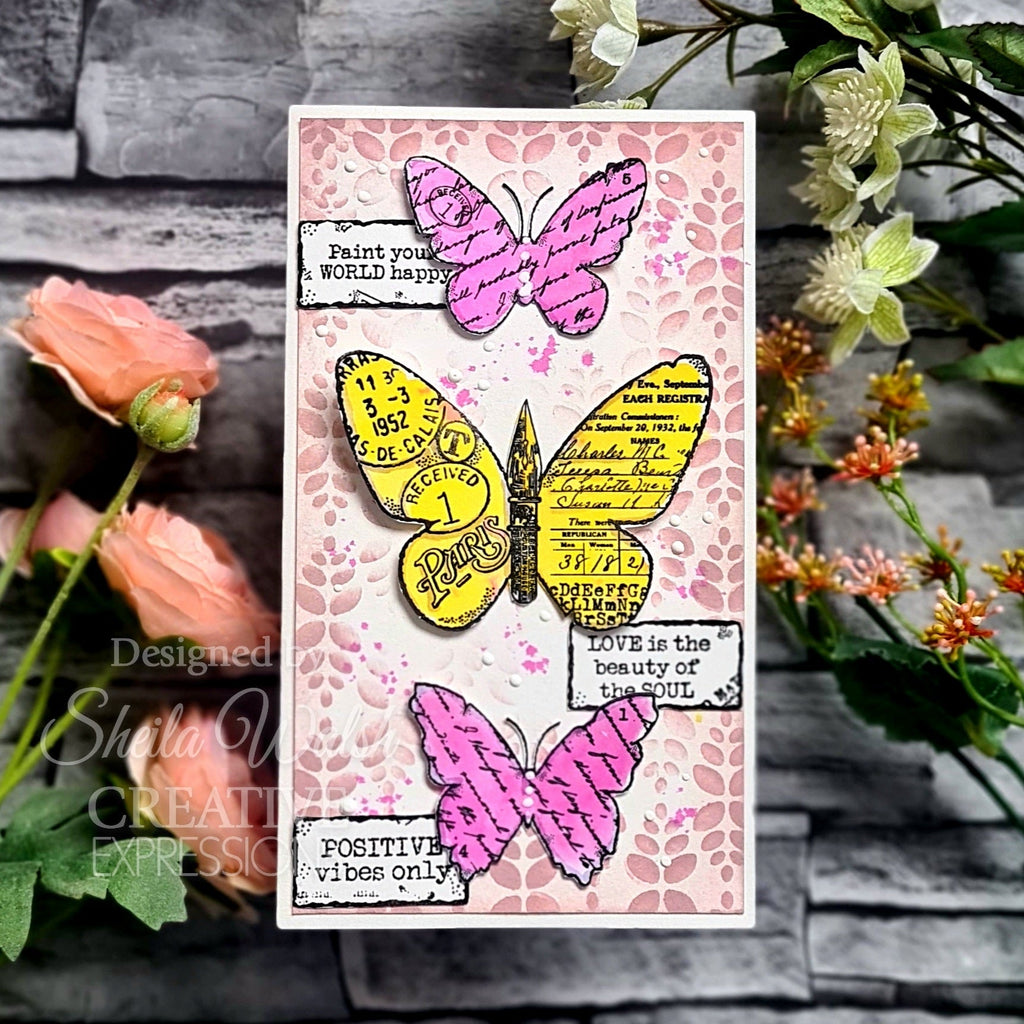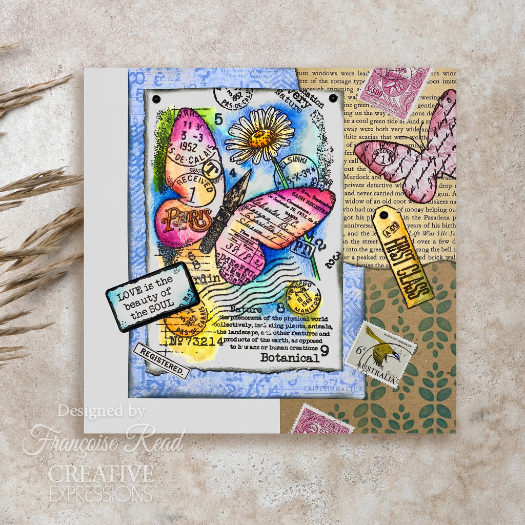 This Torn Paper Butterflies clear stamp set in Francoise's vintage grunge style is perfect to colour with your favourite medium. Designed by Francoise Read this stamp set would be perfect for cards and scrapbook pages as well as mixed media or décor projects. Ready to mount on an acrylic block the stamp can be used with ink pads, paint, or used with pigment ink and embossing powder. They are suitable for use on paper, fabric, or any other surface depending on the ink choice. Clean your stamps with a wipe, damp cloth or under warm running water depending on the medium you use. Made In UK. 5 stamps. Size 3 in x 4 in (7.6 in x 10.2 in).