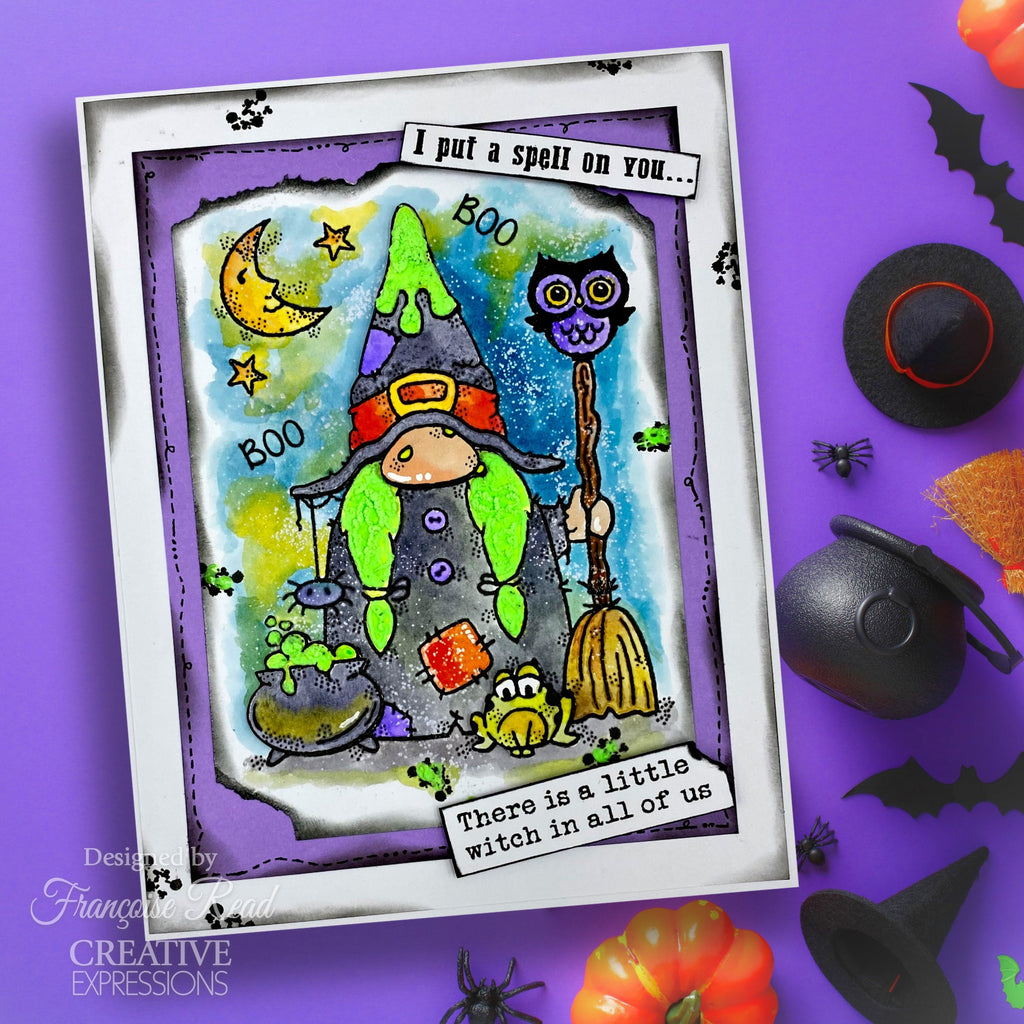This Witchy Woo stamp designed by Francoise Read is perfect for fun Halloween projects. Ready to mount on an acrylic block the stamps can be used with ink pads, paint, or used with pigment ink and embossing powder. They are suitable for use on paper, fabric, or any other surface depending on the ink choice. Clean your stamps with a wipe, damp cloth or under warm running water depending on the medium you use. The high quality photopolymer stamp set is perfect for cards, scrapbooking pages and more. Made In UK. 8 stamps. Size 4 in x 6 in (15.2 cm x 10.2 cm).