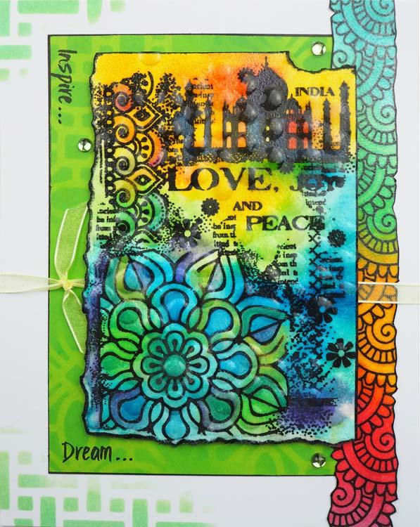 One stamp that incorporates several different images including a large mandala. A great grungy piece. Size: 3.75x5.5 inches.