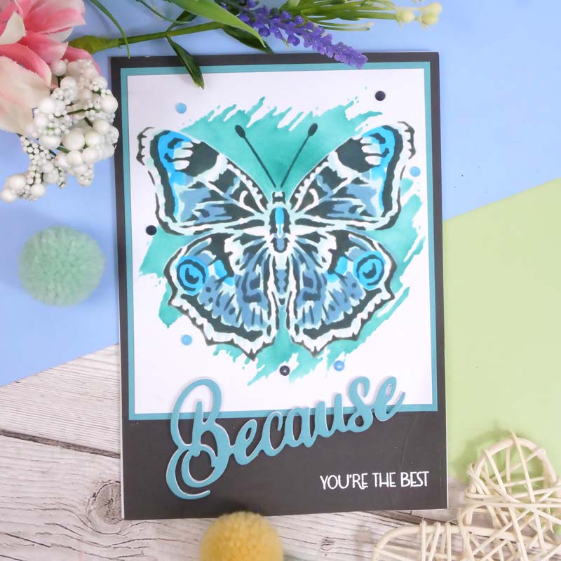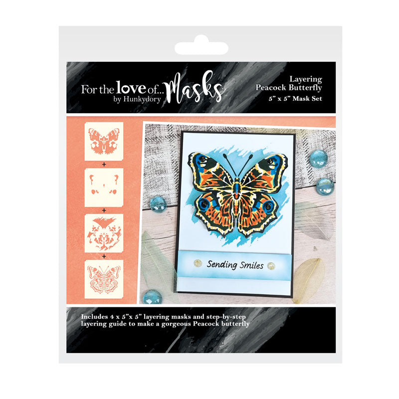 For the Love of Masks - Layering Peacock Butterfly includes four 5” x 5” masks, each labelled for ease with A, B, C and D, whilst two corners are arched for easy alignment. Ink through each mask using the guide included and the suggested Prism Ink Pad colours to create a colourful peacock butterfly with a watercolour wash-style background. Once complete, pair with your favourite sentiment and mat upon a card blank.