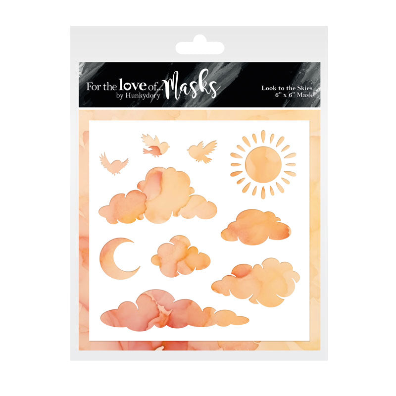 Build unique and colourful backgrounds with the For the Love of Masks - Look to the Skies 6” x 6” mask. The mask features five clouds in various shapes and sizes, three birds in different stances and a sun and moon. Place your mask over your cardstock, ink through your choice of elements using Hunkydory’s range of Prism Ink Pads, move the mask and repeat to build stunning silhouette skies for any card size.