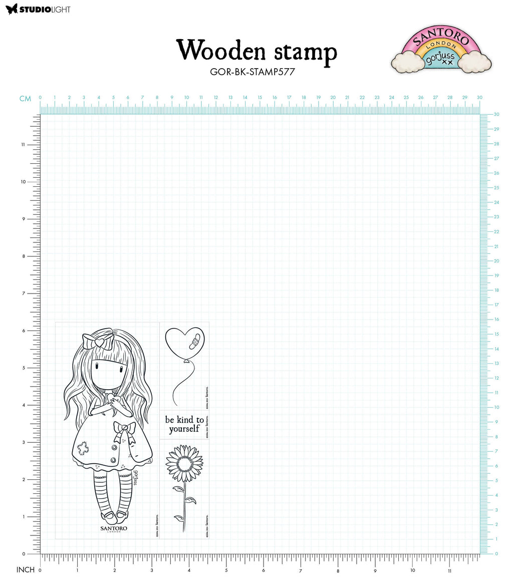 unique 4 piece wooden stamp set. Elements include a girl holding a heart, a heart balloon, a sunflower and text stamp 'be kind to yourself'. Part of the Gorjuss Be Kind collection.