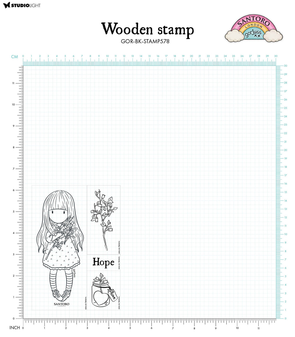 unique 4 piece wooden stamp set. Elements include a girl holding a a rose stem, a rose stem, a jar with a rose stem and heart and text stamp 'hope'. Part of the Gorjuss Be Kind collection.