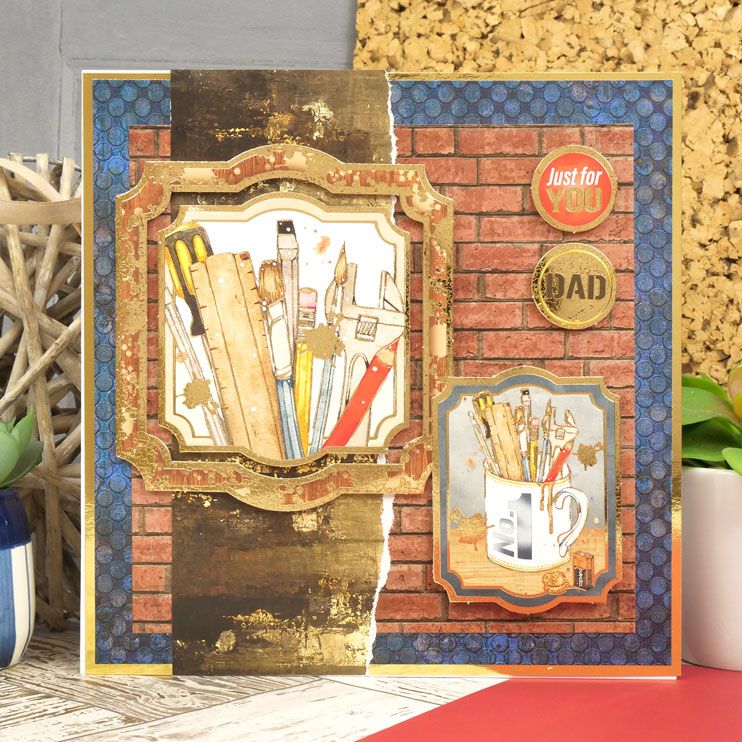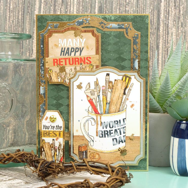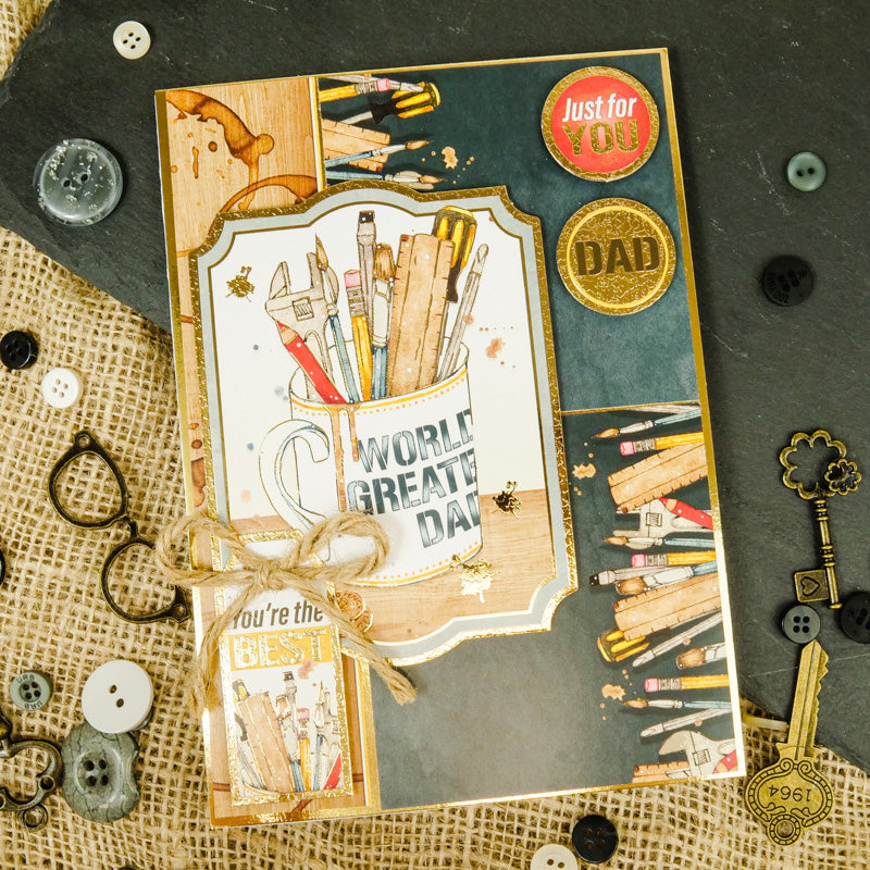 Celebrate dads everywhere with the World's Greatest Dad Topper Sheet. Good for father’s day, birthdays or just to show you care. An old mug full of tools and bits and bobs surely fit’s any man in your life. Textured gold splats give a lot of movement and a fun feel.