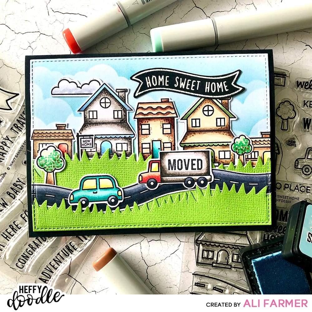 A selection of 10 dies that coordinate with the Home Sweet Home Stamp set (HFD0359). Dies included are for the following images: small, medium and large houses, truck, car, road, the two tree images, the hedge / cloud image and the sign post.