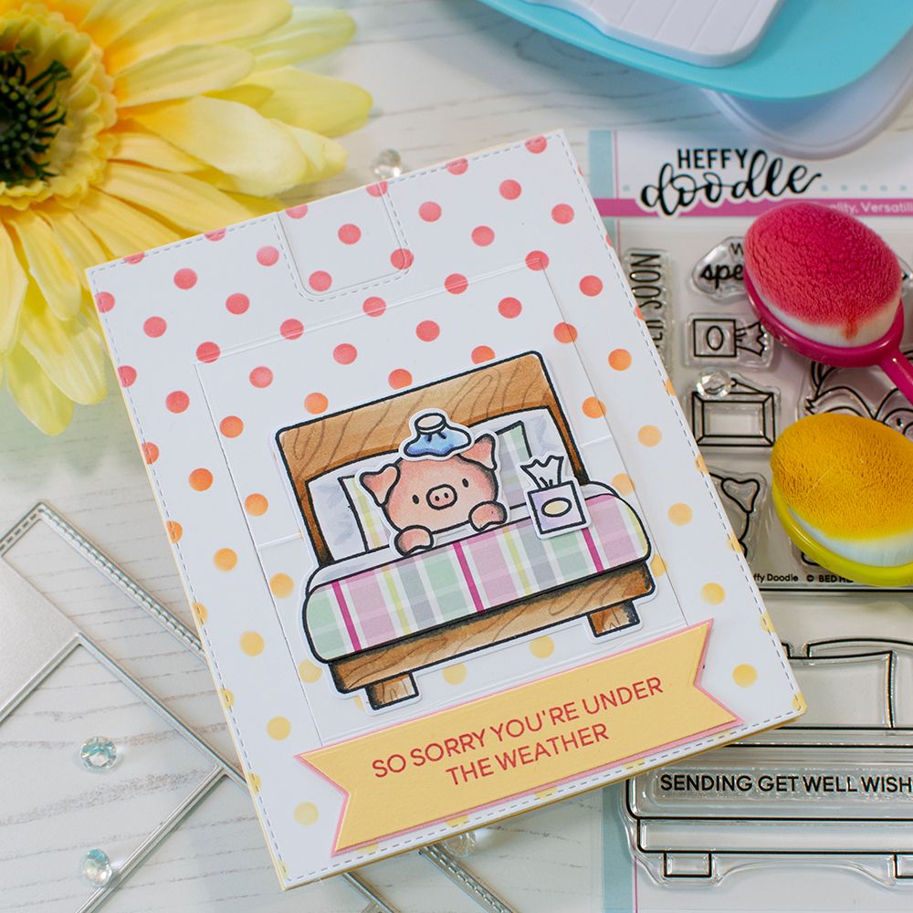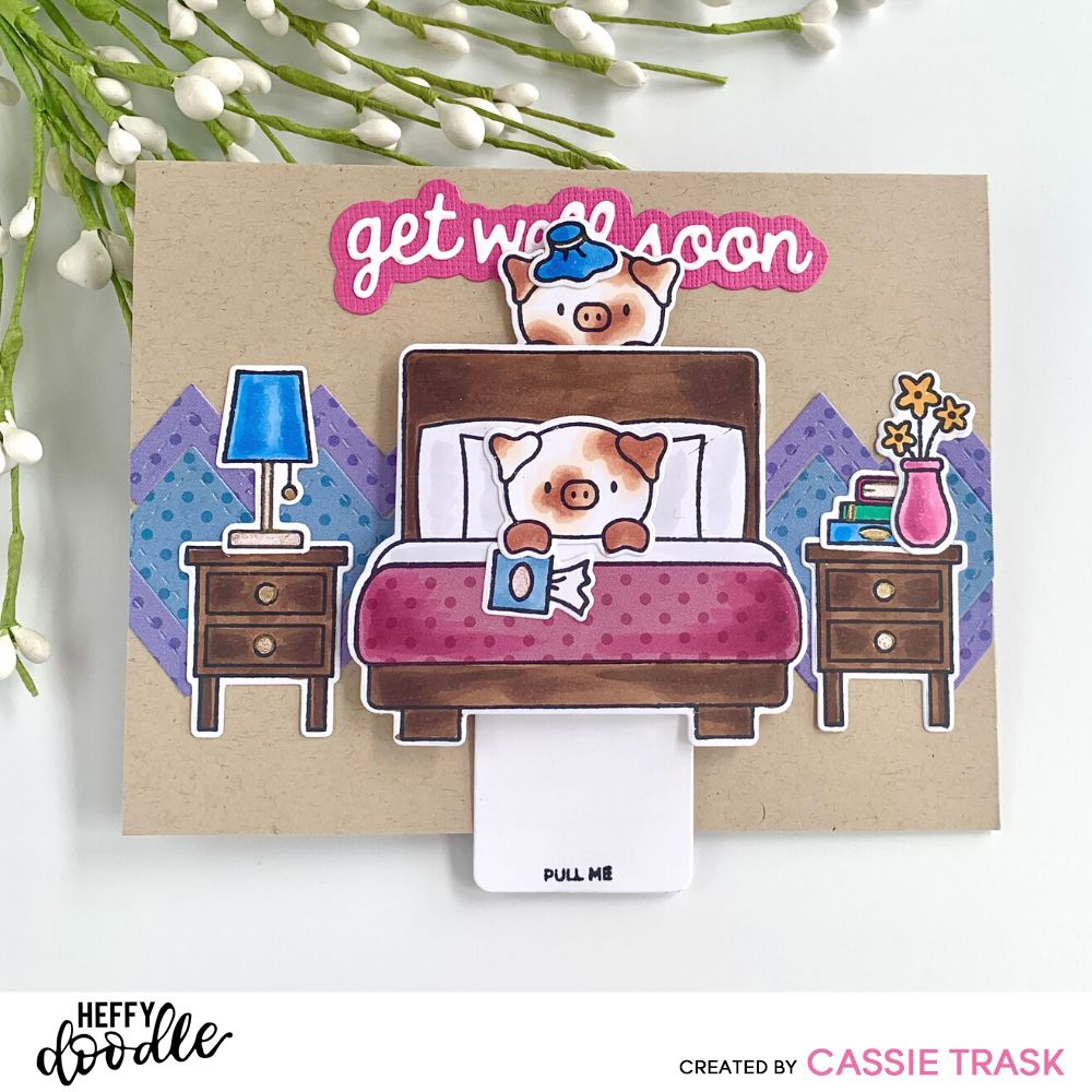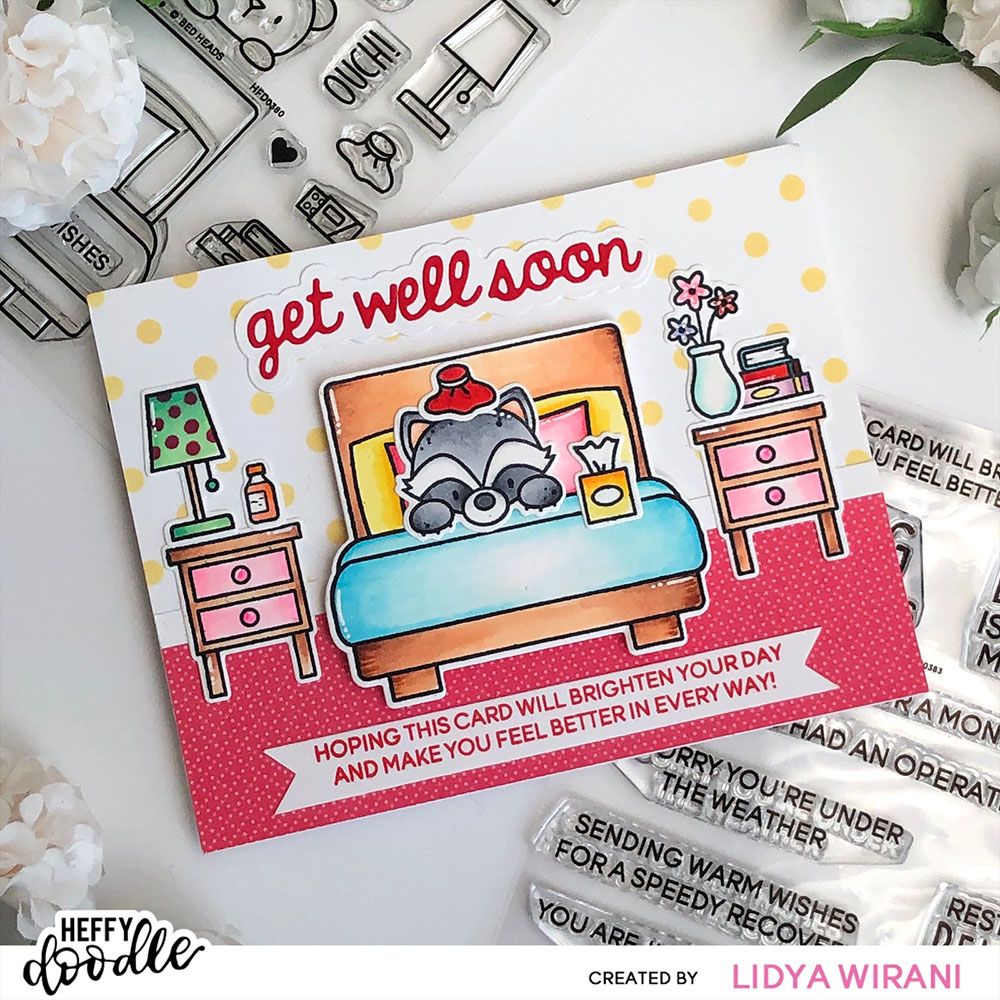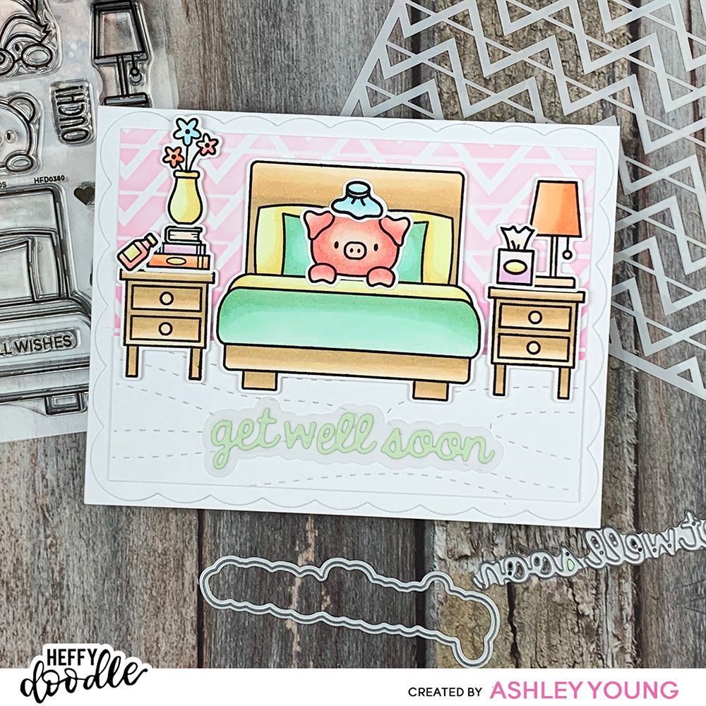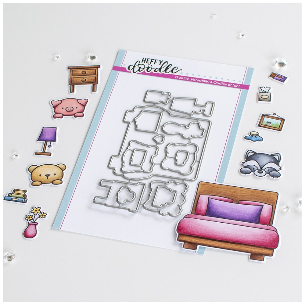 A set of 14 dies that coordinate with the Bed Heads stamp set (HFD0373). Dies are included for the following images: bed, lamp, stack of books, box of tissues, vase of flowers, heart, pig, bear, raccoon, box of pills, bottle of medicine, ice pack and bedside cabinet.