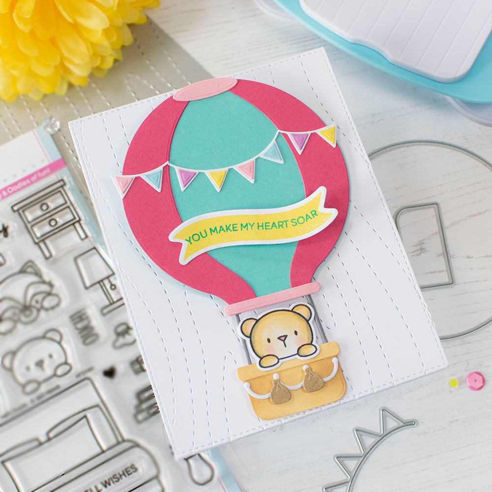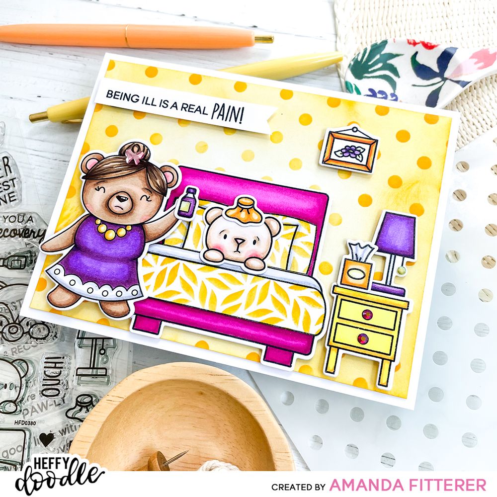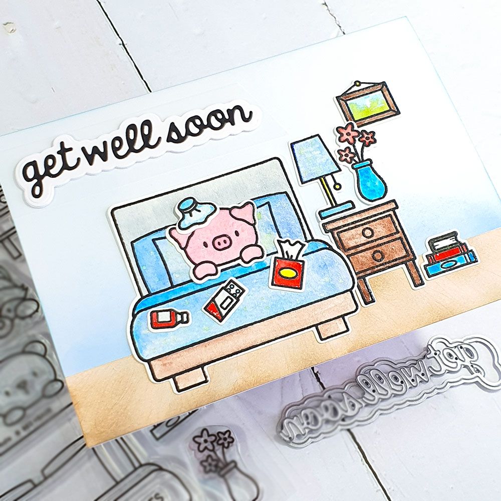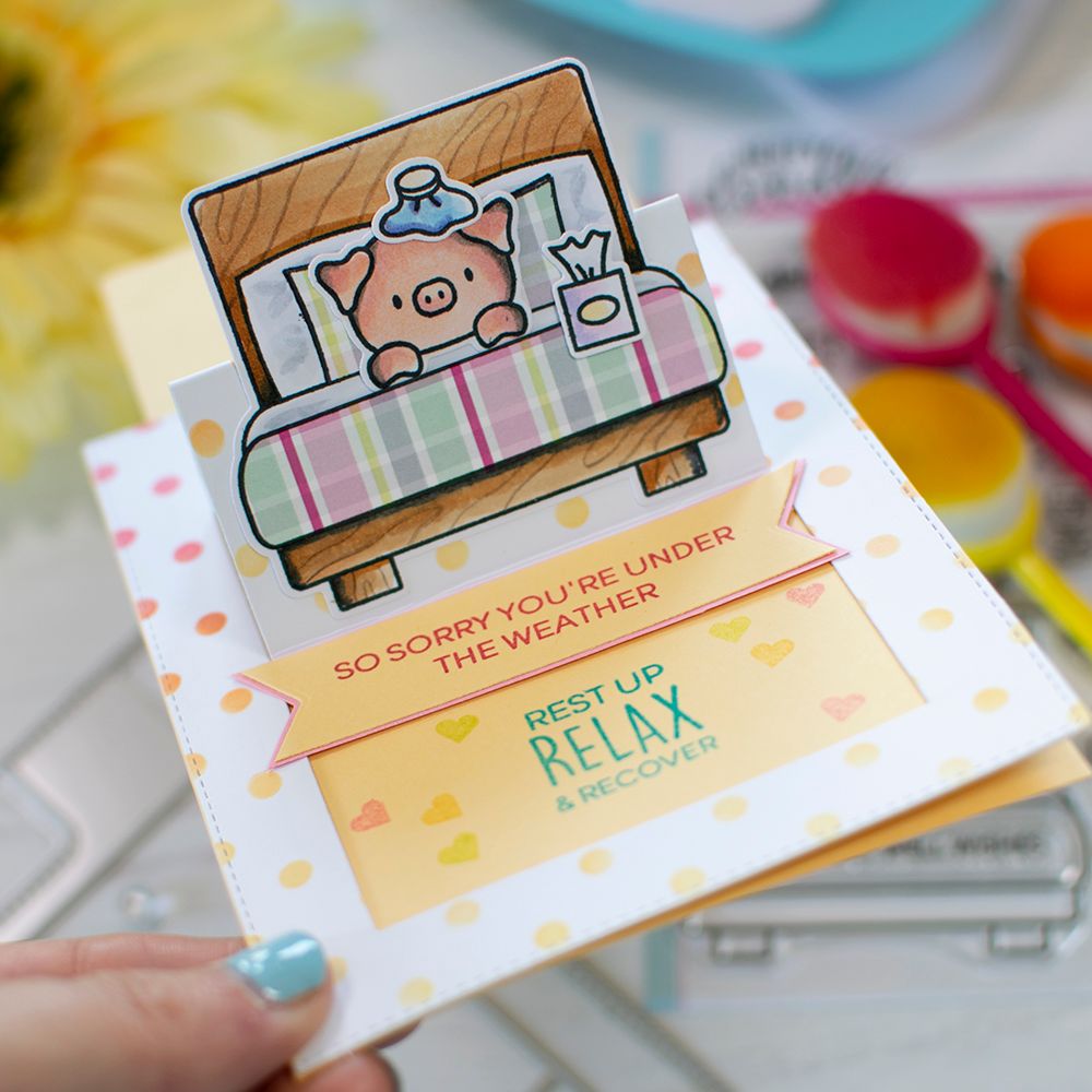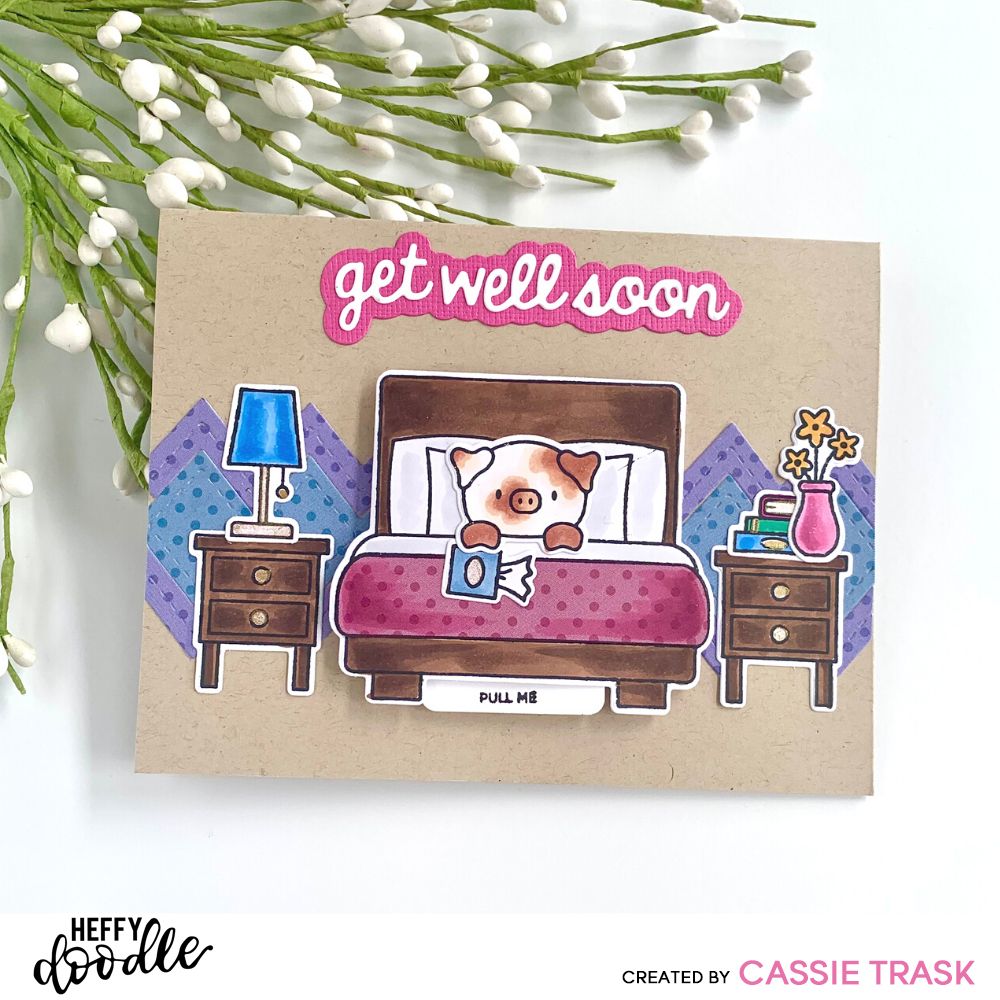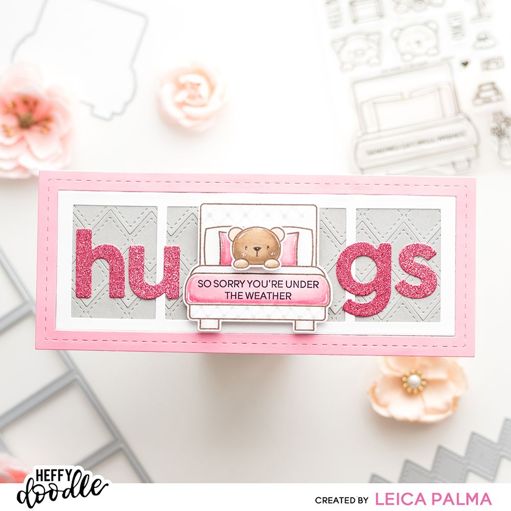 A set of 14 dies that coordinate with the Bed Heads stamp set (HFD0373). Dies are included for the following images: bed, lamp, stack of books, box of tissues, vase of flowers, heart, pig, bear, raccoon, box of pills, bottle of medicine, ice pack and bedside cabinet.