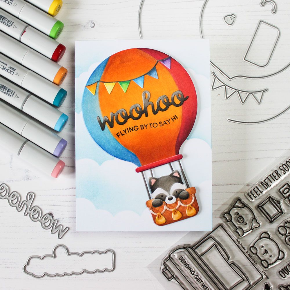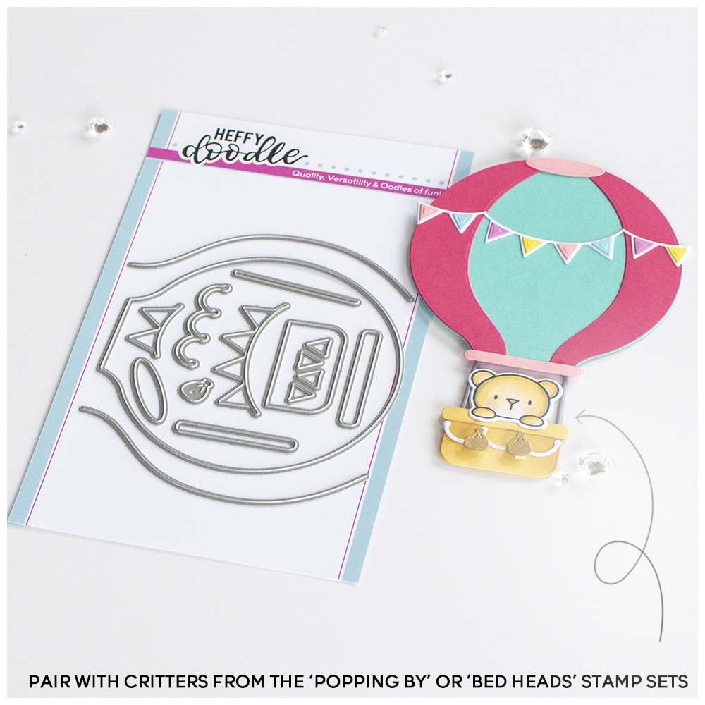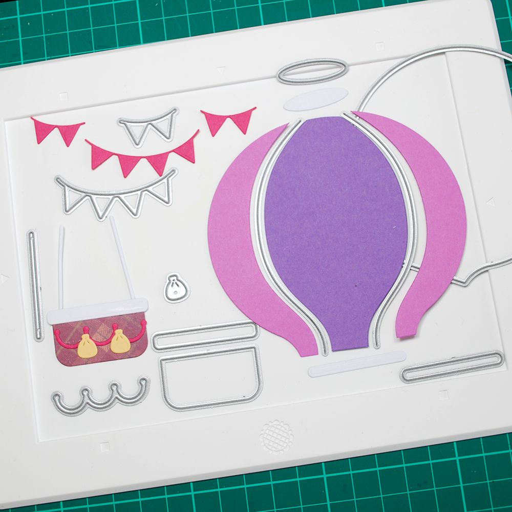 You are sure to get carried away by the super fun Hot Air Balloon die set! A set of 13 dies that can be assembled to create a hot air balloon that will fit onto A2 cards and slimline cards. Use the large die to cut a base panel, then trim down other base panels to create layered wedges for your balloon. The set also includes ropes, a basket, sandbags, and dies to create your own bunting banner. You can also use the large balloon die with the sandbag die to create a floating balloon effect on your cards.