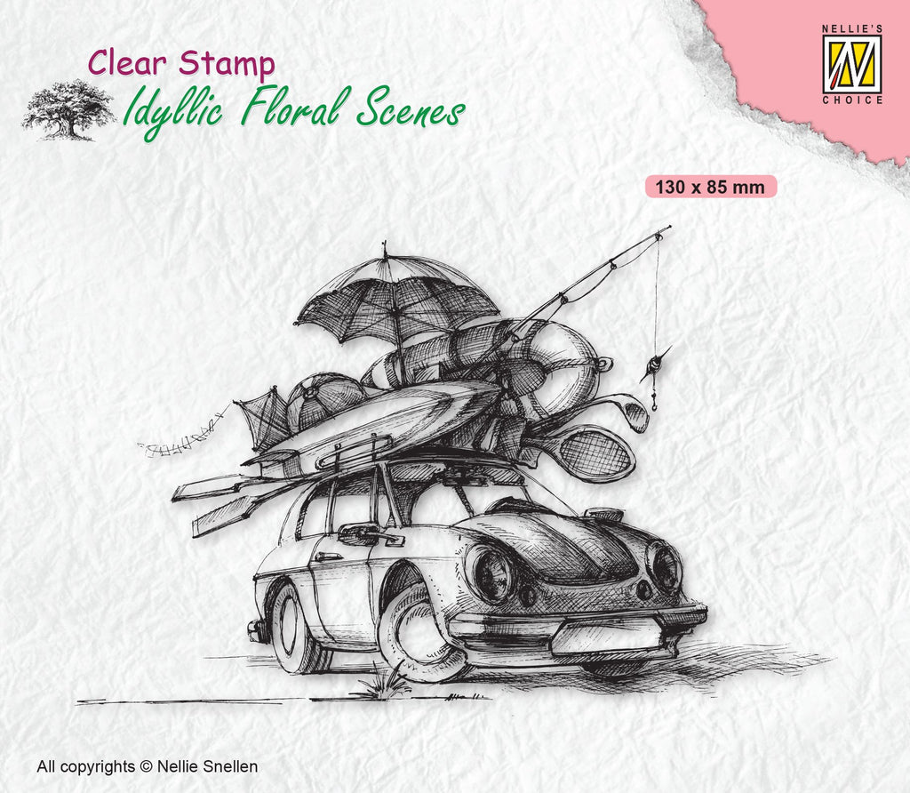 This is a clear stamp of an intricately drawn car loaded down with vacation gear. This stamp is part of the Idyllic Floral Scenes Collection, which includes a range of large clear stamps with beautiful and highly detailed scenes that are big enough to make an entire card - simply colour with your favourite inks!