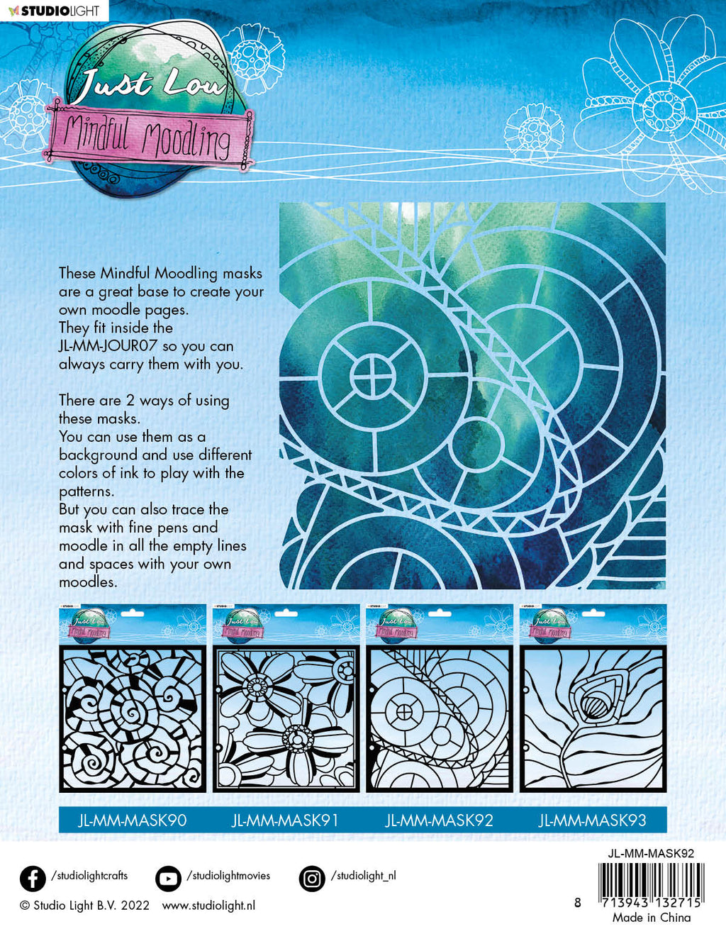 This Mindful Moodling mask is a great base to create your own moodle pages.  It fits inside JL-MM-JOUR07 so you can always carry it with you.  There are two ways of using this mask.  You can use it as a background and use different colours of ink to play with the patterns.  But you can also trace the mask with fine pens and moodle in all the empty lines and spaces with your own moodles.  Use this stencil with your favourite inks, paints, pastes and more to create beautiful background for your cards and art journal pages.