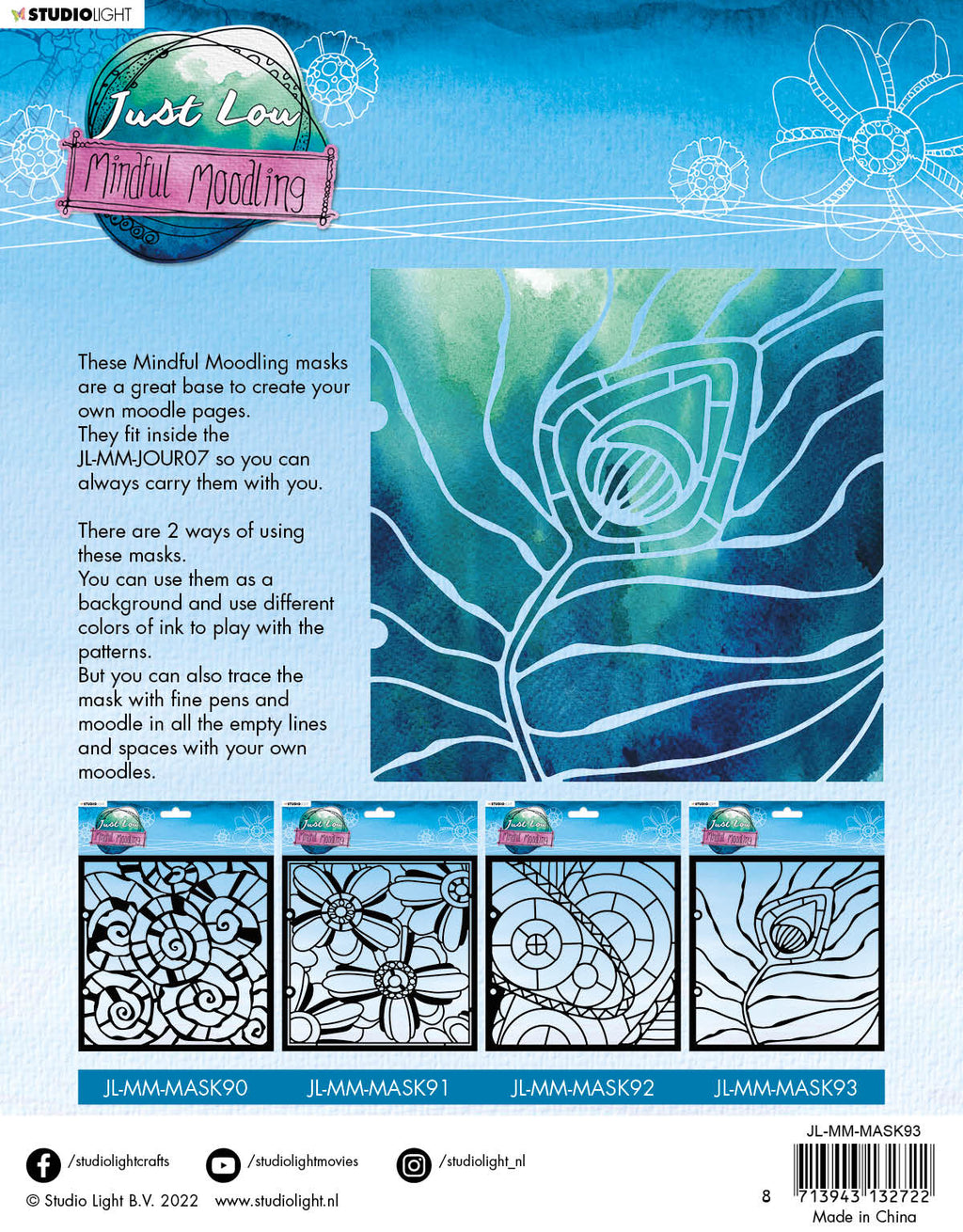 This Mindful Moodling mask is a great base to create your own moodle pages.  It fits inside JL-MM-JOUR07 so you can always carry it with you.  There are two ways of using this mask.  You can use it as a background and use different colours of ink to play with the patterns.  But you can also trace the mask with fine pens and moodle in all the empty lines and spaces with your own moodles.  Use this stencil with your favourite inks, paints, pastes and more to create beautiful background for your cards and art journal pages.