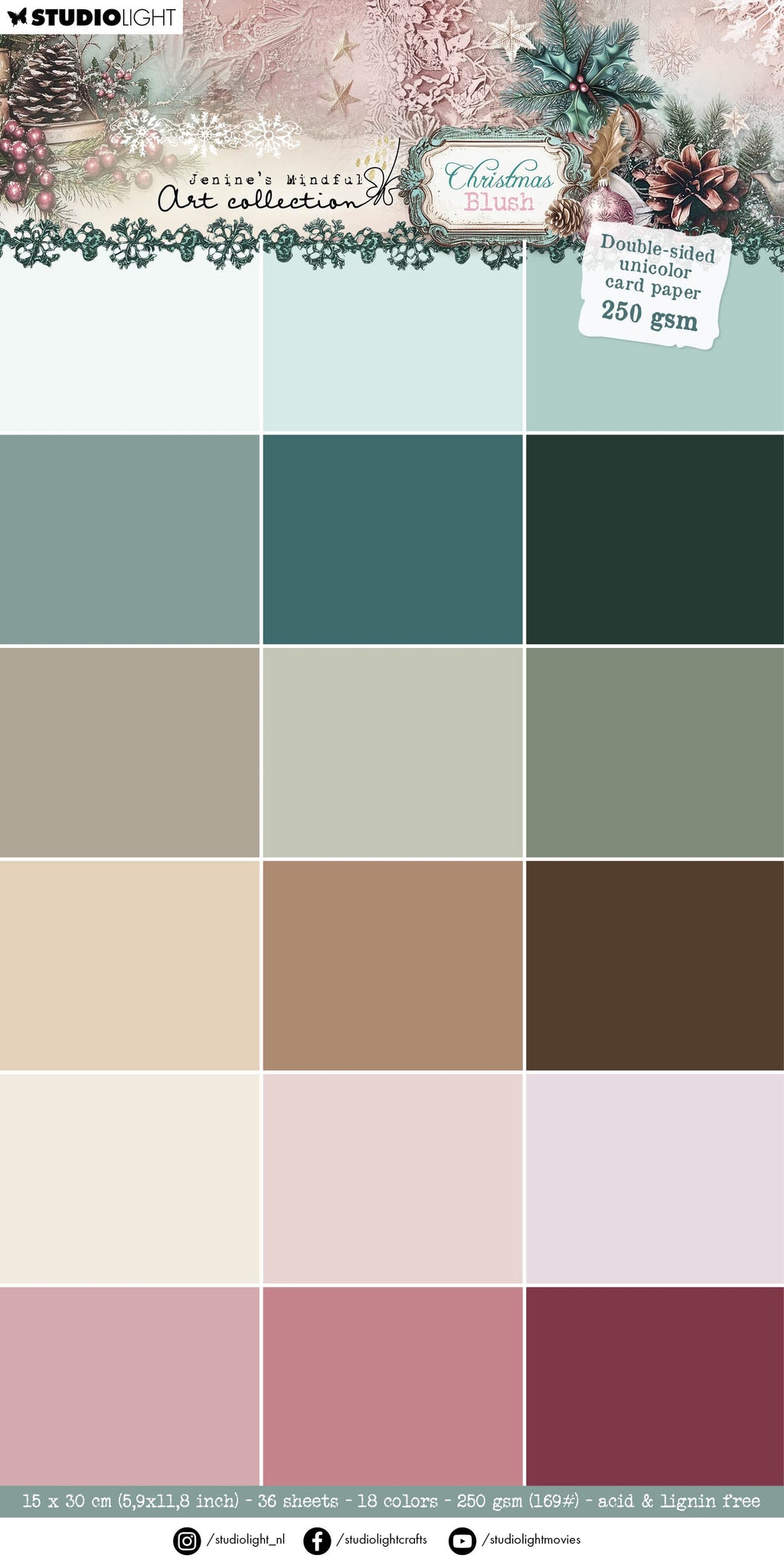 This double-sided unicolor paper pad has 36 sheets with 18 colours, 250gsm. Perfect for Christmas and Winter cards, scrapbooking or journaling projects.  Part of Jenine's Mindful Art Collection.