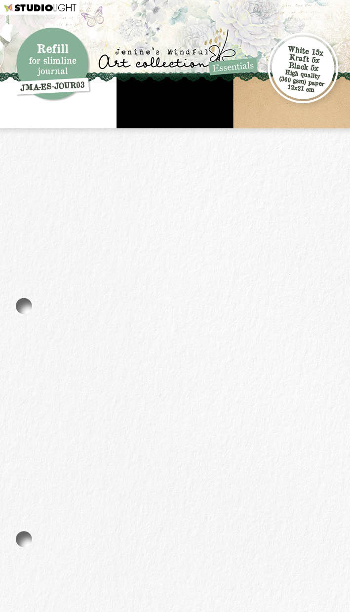 Refill pages for Slimline Journal (JMA-ES-JOUR03) includes 3 kinds of paper: white x15, kraft x5 and black x5. All pages are high quality 300 gsm paper. Acid and lignin free. Part of the Jenine's Mindful Art collection.