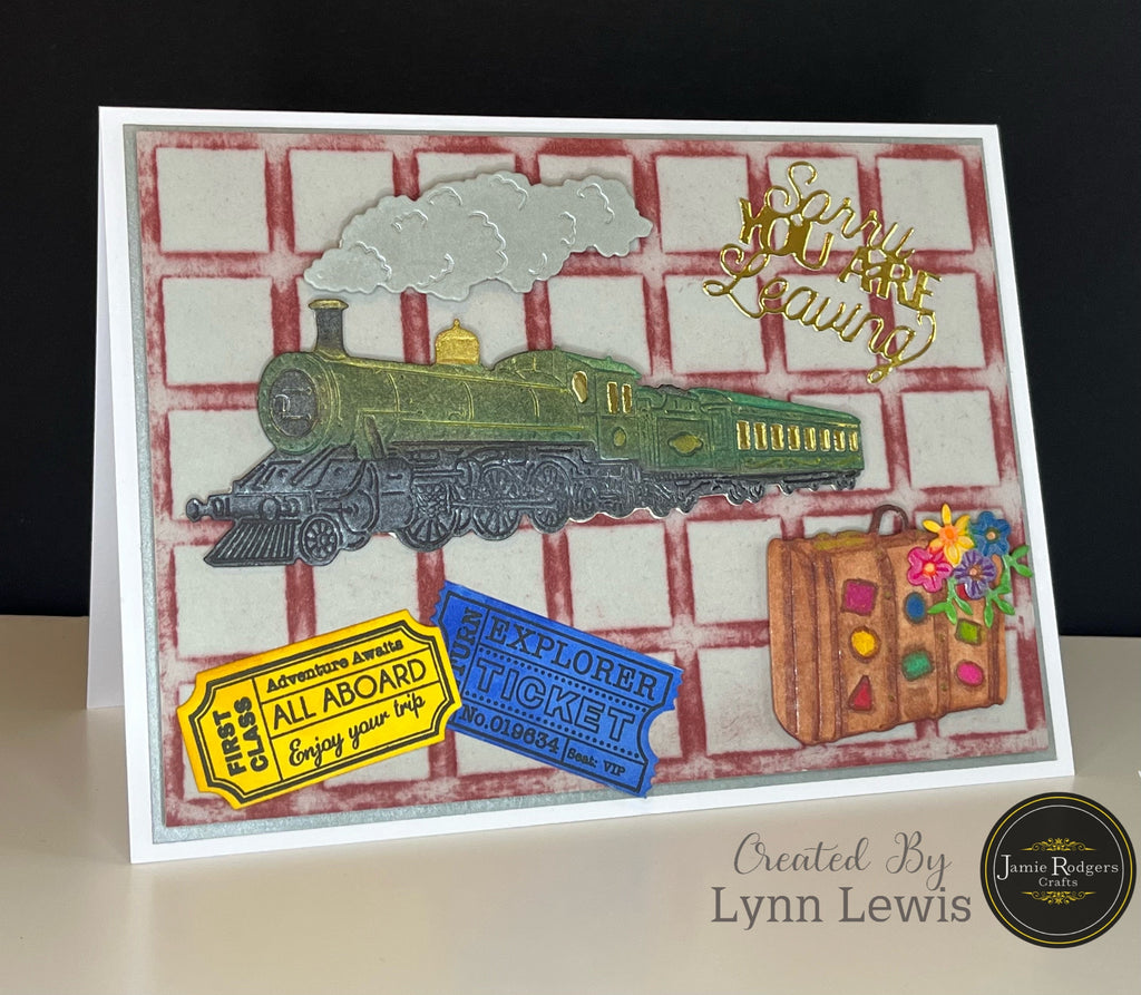 A detailed steam train die and a complementary travel-themed die for versatile design options.