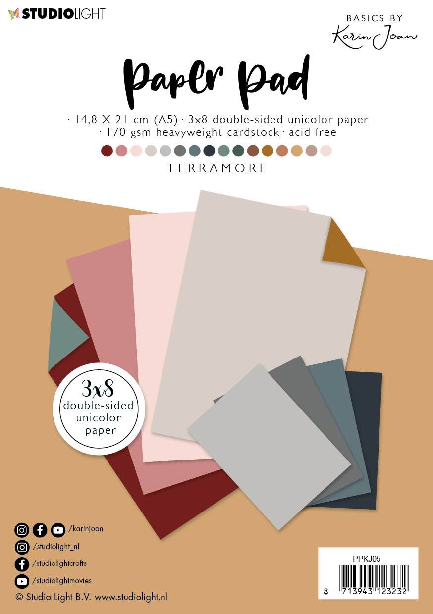 This bundle also contains a 3" x 8" (A5) size paper pad of acid free 170 gsm paper - Karin Joan Paper Pad Pattern Paper Terramore Basics by Karin Joan nr.5. There are 24 sheets of fully colored, double-sided 170 gsm cardstock. The colours are coordinating and have both patterened and solid sides. There are 3 sheets of each design, 8 different designs total.
