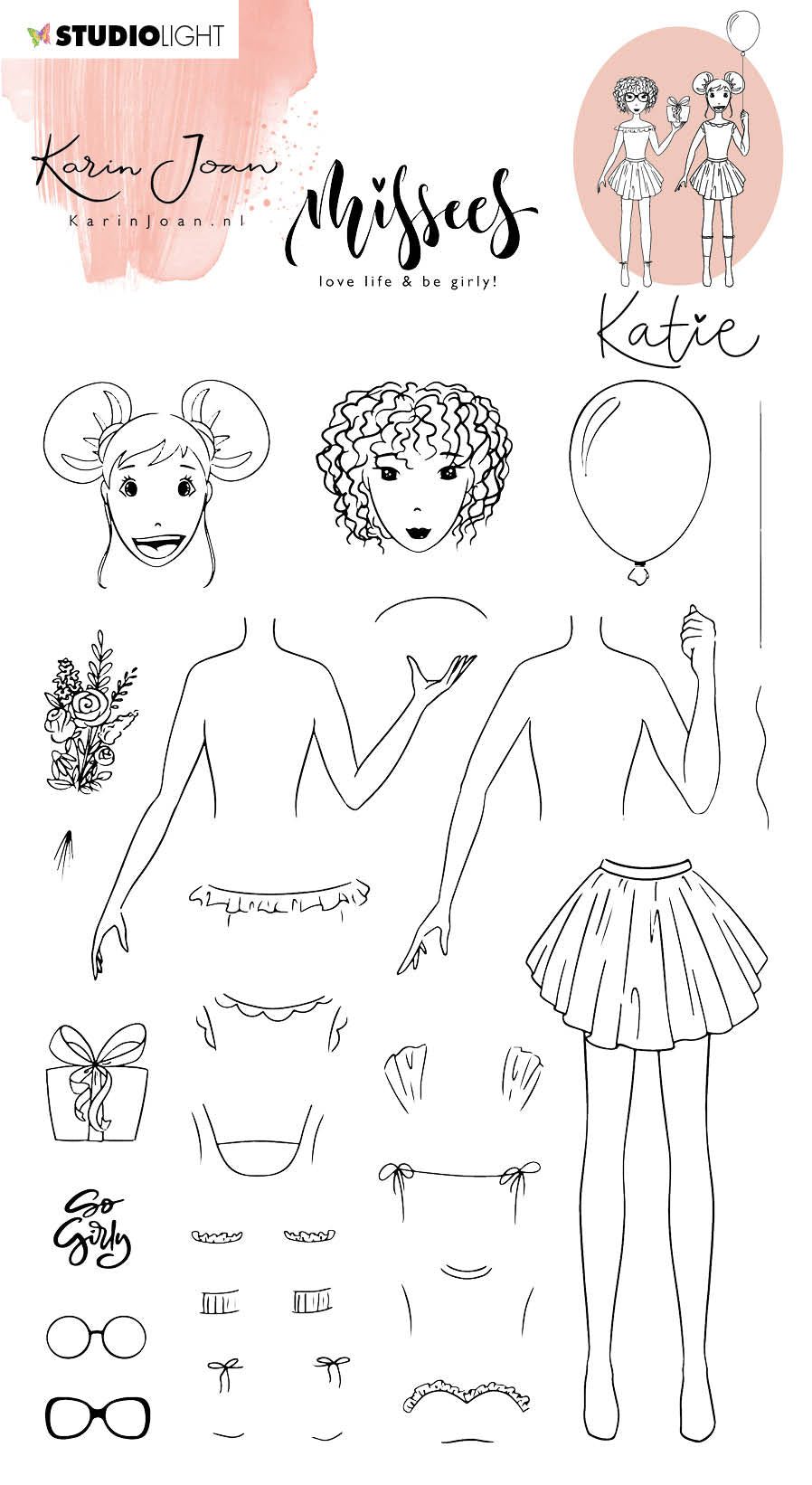 This fun 24 piece stamp set from the Karin Joan Missees collection includes everything you need to build your own custom Missees. Customize Katie by choosing a face and hairstyle and torso then add clothing and accessories. They can be used for scrapbooking, journaling and card making.