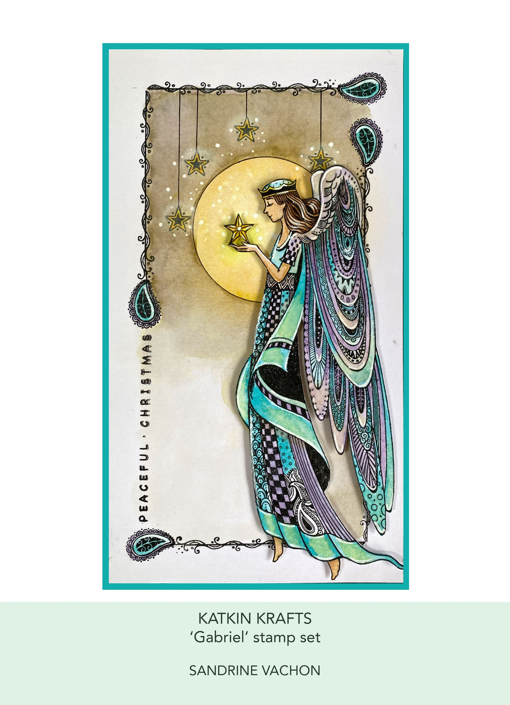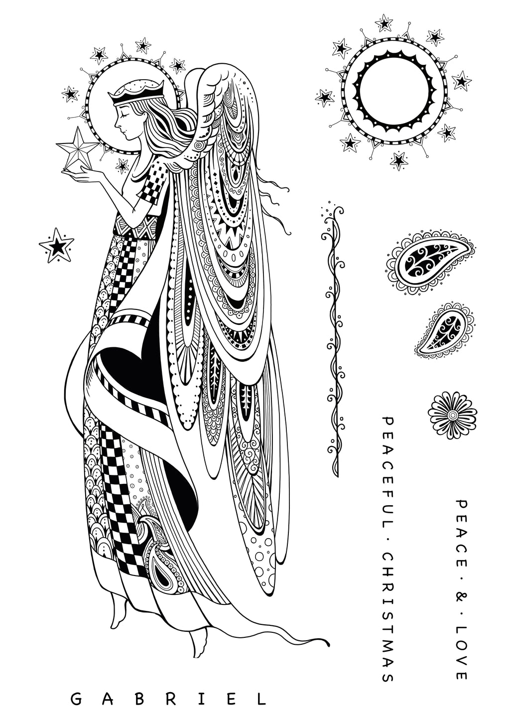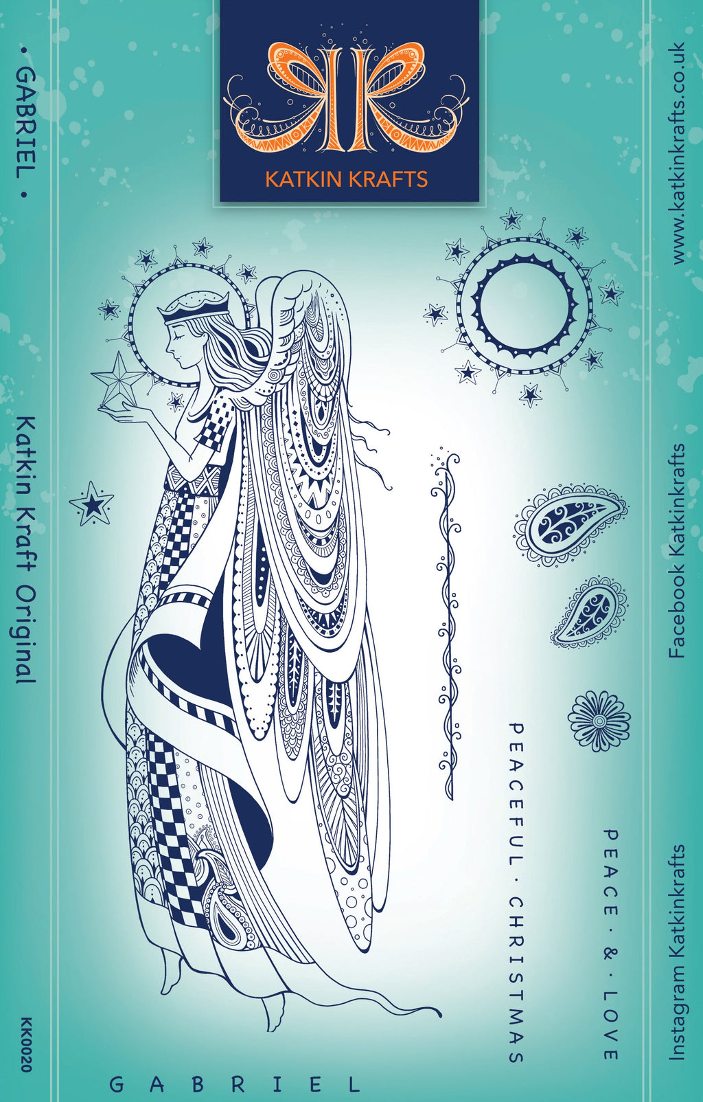 Gabriel is a gorgeous hand drawn stamp from Katkin Krafts Christmas collection featuring one main image of the angel Gabriel and nine smaller elements and sentiments. Made from deep etched, quality photopolymer the stamps are ready to mount on an acrylic block. The stamps can be used with ink pads, paint, or used with pigment and embossing powder. They are suitable for paper, fabric, or any other surface depending on the ink choice. You can also spritz the fabric with water after stamping but before heat sealing to create lovely watercolour background washes. Store flat away from heat and sunlight. Made In UK. 10 stamp set. Size 6 in x 8 in (15 cm x 20.3cm).
