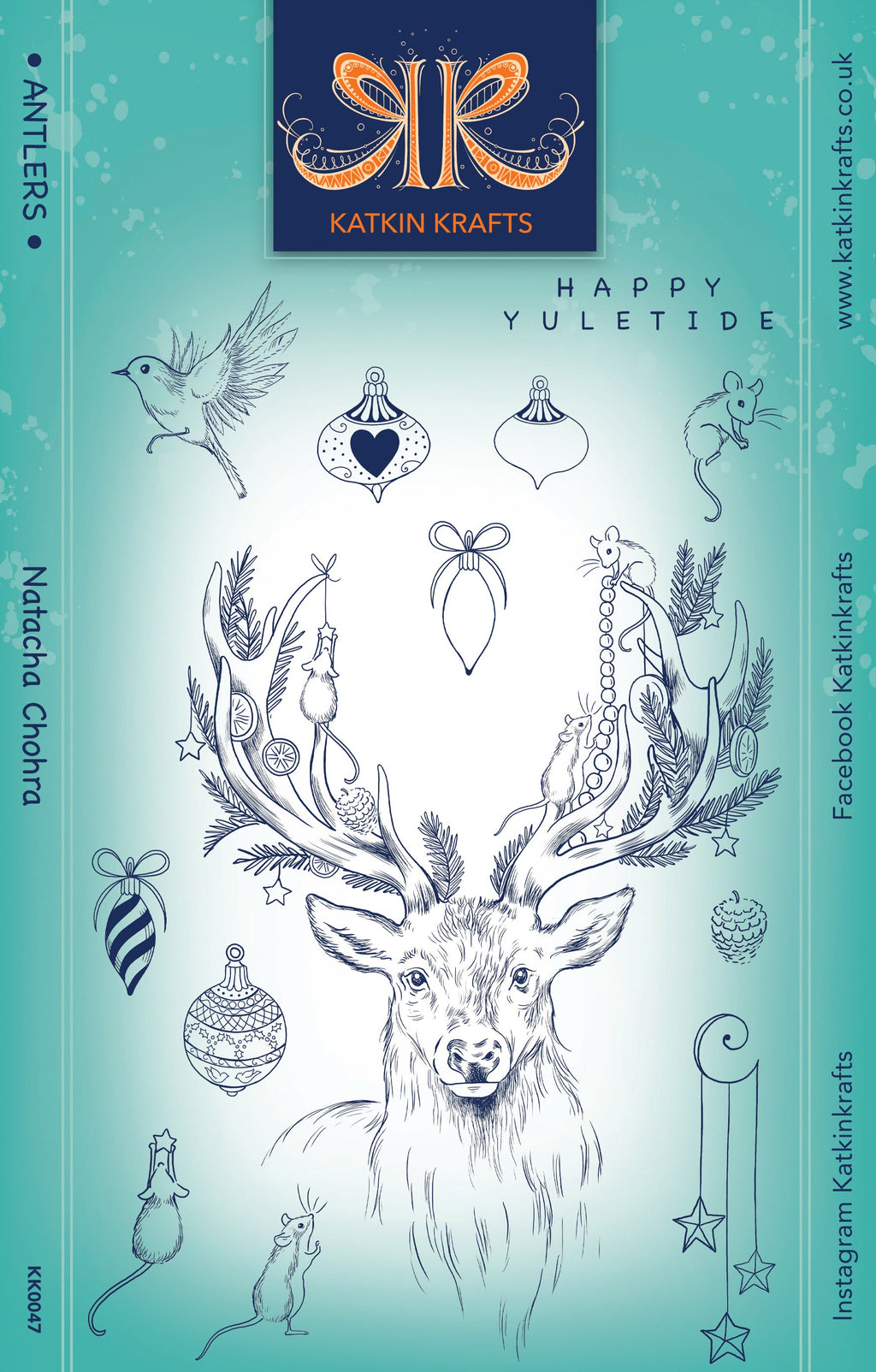 Antlers is a gorgeous hand drawn stamp from Katkin Krafts Christmas collection featuring one main image of a festively adorned stag and 12 smaller elements and sentiments. Made from deep etched, quality photopolymer the stamps are ready to mount on an acrylic block. The stamps can be used with ink pads, paint, or used with pigment and embossing powder. They are suitable for paper, fabric, or any other surface depending on the ink choice. You can also spritz the fabric with water after stamping but before heat sealing to create lovely watercolour background washes. Store flat away from heat and sunlight. Made In UK. 13 stamp set. Size 6 in x 8 in (15 cm x 20.3cm).