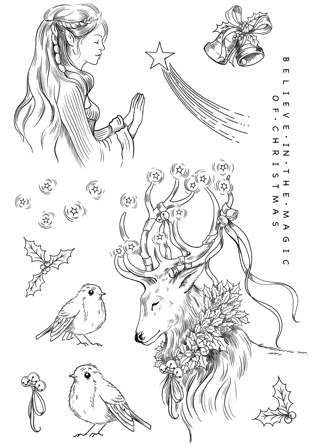 Yuletide Greetings is a gorgeous hand drawn stamp from Katkin Krafts Christmas collection featuring an image of a mystical woman and a festively adorned stag plus some smaller elements and sentiments. Made from deep etched, quality photopolymer the stamps are ready to mount on an acrylic block. The stamps can be used with ink pads, paint, or used with pigment and embossing powder. They are suitable for paper, fabric, or any other surface depending on the ink choice. You can also spritz the fabric with water after stamping but before heat sealing to create lovely watercolour background washes. Store flat away from heat and sunlight. Made In UK. 11 stamp set. Size 6 in x 8 in (15 cm x 20.3cm).