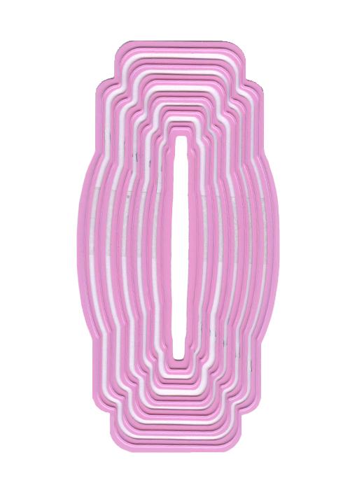 6 shaped frames by Nellie's Choice. Each frame is nested in 1/8" increments to easily build layers or as frames. Multi dies will cut any patterns of paper, cardboard, felt, etc. Sizes are from largest die, 1 1/2 x 3 1/8 in. to smallest die 3/16 x 1 7/8 in.